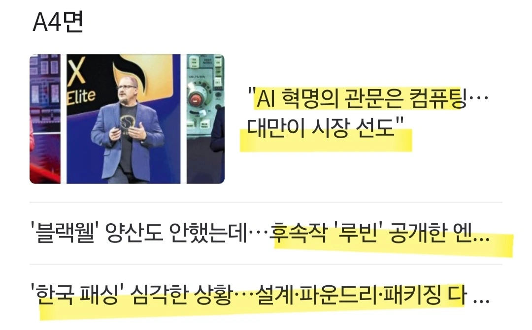 [요약] 글로벌 AI 반도체 전쟁에서 한국이 변방으로 밀리고 있다는 우려. 각 기업이 설계한 AI 서비스를 제대로 구현하려면 범용 칩이 아니라 맞춤형 반도체가 필요한데, 한국 기업들이 이 분야에서 힘을 못 쓰는 중. 핵심인 반도체 칩 설계는 엔비디아 애플 AMD 등 미국 팹리스(반도체 설계 전문 기업) 천하. 이들의 주문을 받아 반도체를 제조하는 파운드리와 패키징은 대만 TSMC.