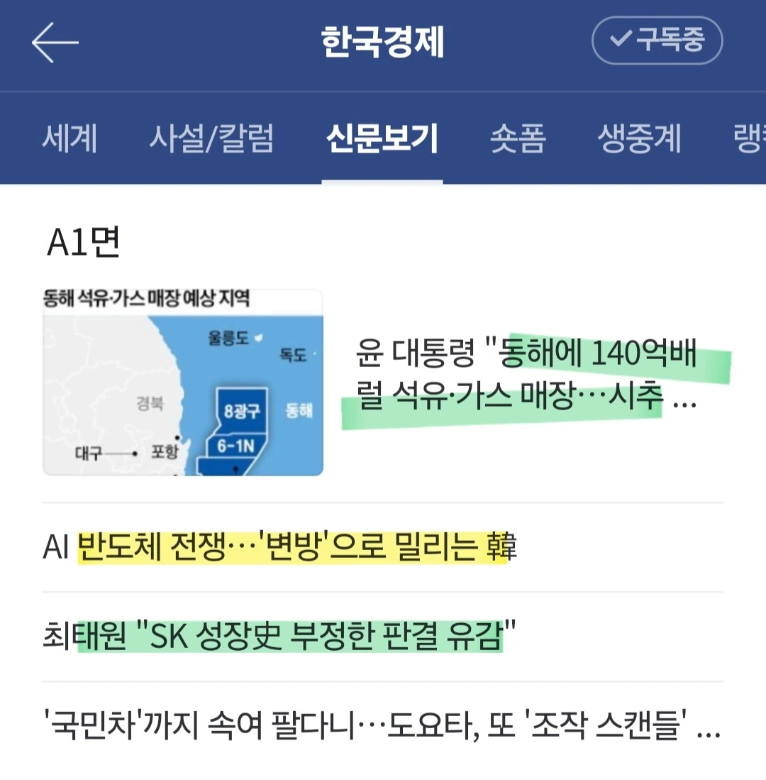 포항 앞바다 영일만 석유 이야기를 대부분 주요 기사로 다뤘지만 난 잘 모르겠다. 주식시장은 난리고 다들 뭐라고 이야기하지만 너무 오래 살면서 의심이 늘었기 때문이겠지. 관심 있는 분들은 알아서 잘 챙겨 보시면 될 듯.