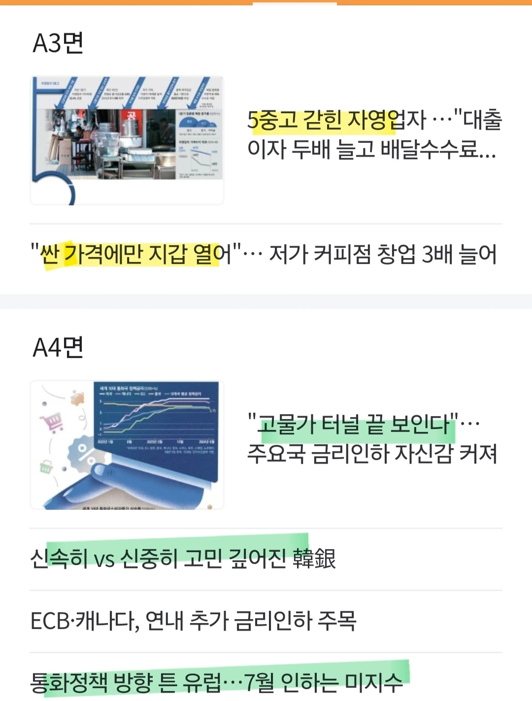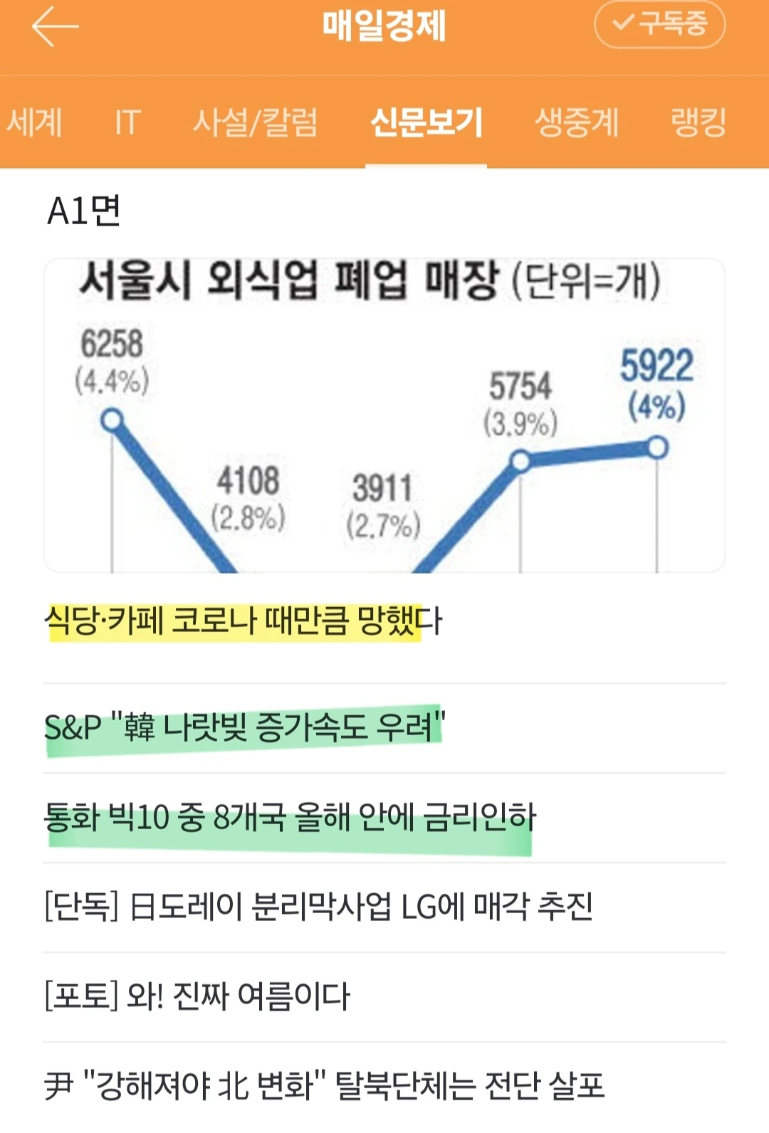 [자영업자 어려움] 밑바닥 경기가 심상치 않게 돌아간다는 것을 방증. △고금리에 따른 이자 부담 증가 △고물가로 지갑을 닫는 소비자 △저가품 위주의 출혈경쟁 △최저임금 인상으로 인건비 증가 △배달 플랫폼 수수료 부담이라는 5중고