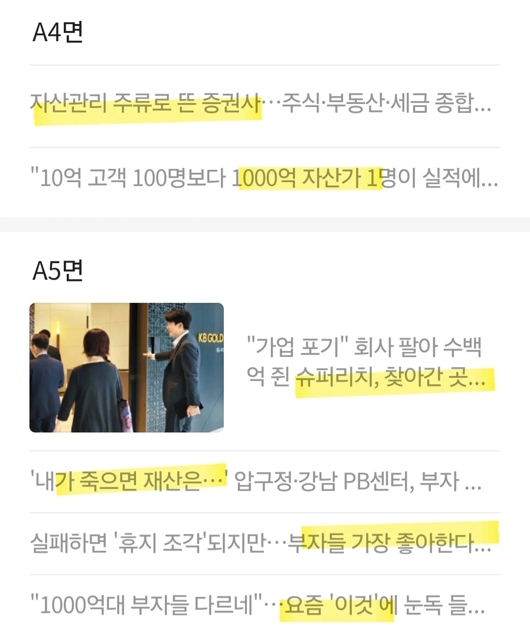 [요약] 금융자산 30억원 이상 고액 자산가가 국내 증권사에 맡긴 자산이 1000조원 돌파. 베이비붐 세대(1955~1963년생)가 노후 대비와 증여를 위해 금융상품 가입 + 창업과 주식, 암호화폐 등으로 막대한 부를 쌓은 청년 갑부(영리치)까지 뭉칫돈. 자산관리(WM) 시장이 폭발적으로 성장. 매달 11조원이 증권사로 유입. “최근 5년간 한국투자증권의 리테일 자산 규모가 연평균 24% 증가했을 정도로 고액 자산가들이 증권사의 고수익 상품에 몰리고 있다” “우리나라 가계 순자산 1경원 중 부동산을 제외한 현금성 자산이 약 5000조원임을 고려할 때 WM 시장은 성장 잠재력이 크다”