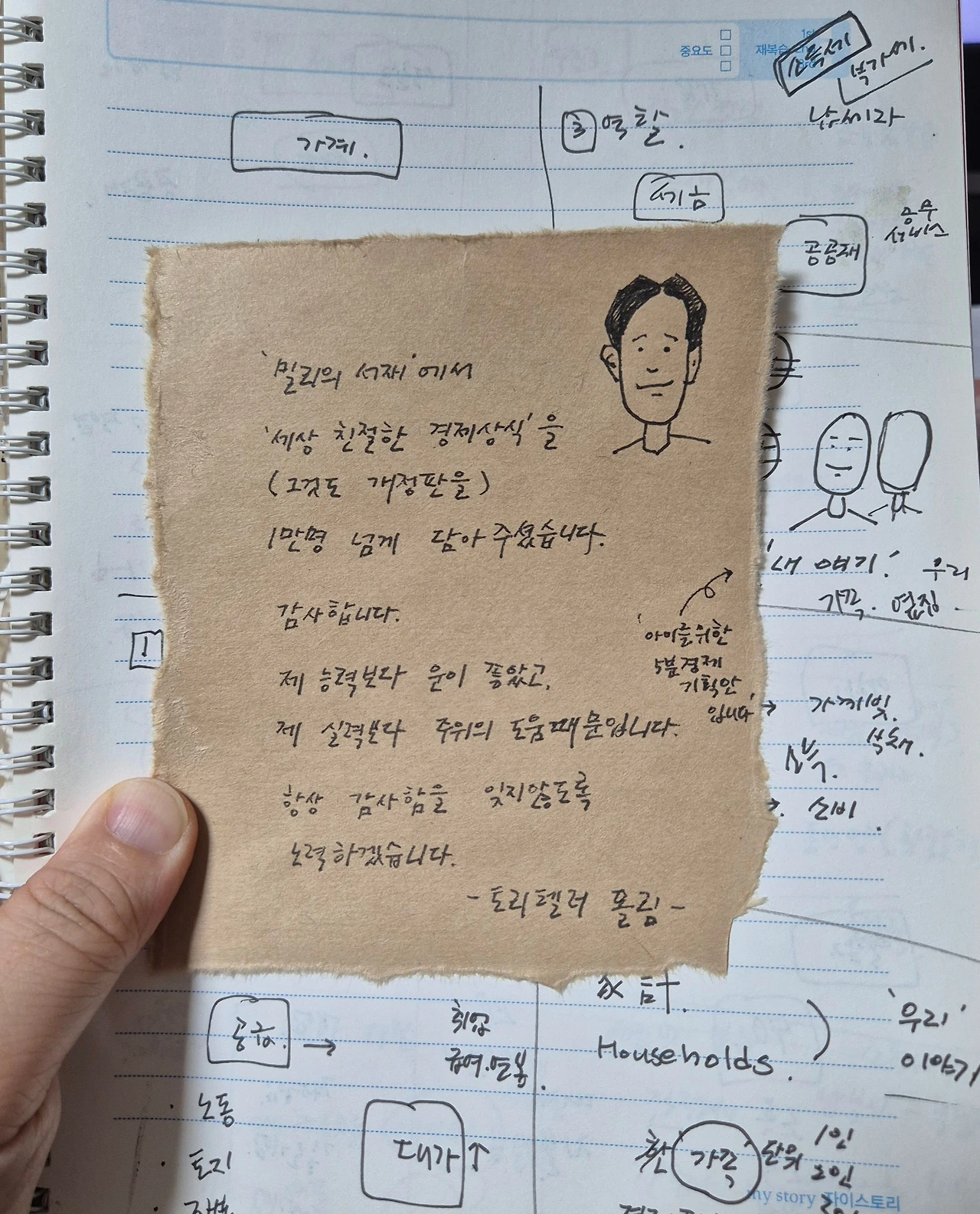 하나. 배경은 '어린이를 위한 5분 경제만화' 기획안입니다. 8컷짜리 만화를 그리기 전. 키워드 중심으로 스토리를 만들어 봅니다. 기획안 대로 쓰는 경우 별로 없습니다. 제 글씨를 제가 몰라보는 경우. 아주 흔한 일입니다.