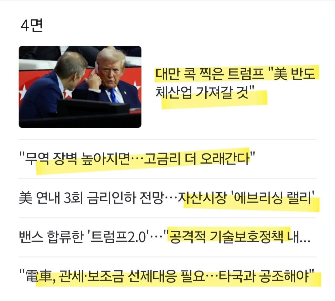 [정부대응] 다음 주 반도체와 자동차·배터리 업계 등 트럼프 당선에 영향을 가장 많이 받는 기업 최고경영자(CEO)들과 통상 전략을 논의 예정. SK하이닉스와 LG엔솔·SK온 등이 참석 대상으로 검토.