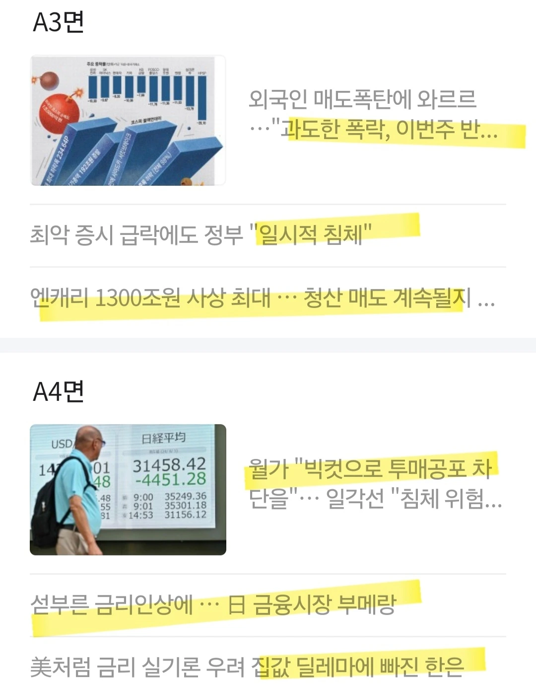 [일본 주식시장] 공황 상태. 올해 상승분을 대부분 반납한 가운데 추가 하락 가능성도. 미국과의 동조 현상을 대표적 이유로 꼽지만, 섣부른 일본은행의 금리 인상을 원인으로 거론하기도. 급격한 엔고로 수출 비중이 큰 일본기업 미래를 어둡게 만들었다는 평가. 급격한 엔고가 수출 기업이 많은 일본 경제에 부담이 될 것이라는 위기감도 증시 급락을 부채질. 최근 하락폭이 큰 종목을 보면 자동차·반도체·화학 등 수출에 크게 의존하는 업종.
