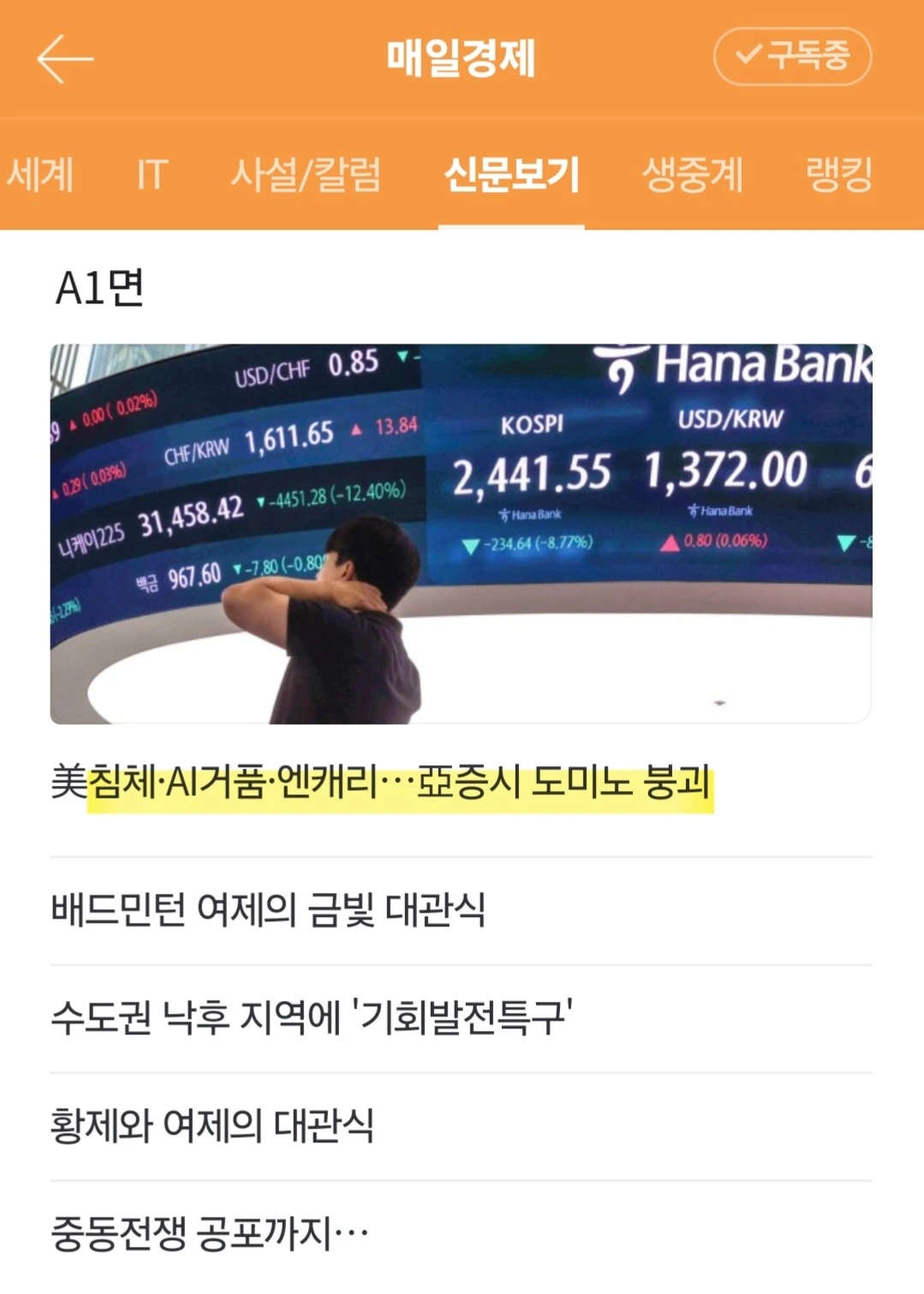 [요약] '패닉 셀'(공황 매도). 미국 경기침체, 빅테크 기업 실적 악화 우려가 일파만파 퍼지며 5일 아시아 증시가 새파랗게. 장중 코스피와 코스닥이 동시에 8% 넘게 폭락하자 2020년 3월 19일 이후 4년5개월 만에 거래를 일시 중단하는 '서킷 브레이커'가 발동. 이날 오후 미국 증시 선물시장에선 나스닥 선물이 5% 하락하자 서둘러 매도하려는 주문이 몰리면서 주간거래 주식매매가 중단되기도. 반면 채권시장은 기준금리 인하 기대감에 초강세. 한국 증시가 코로나19 팬데믹 때보다 큰 충격을 받으며 기록적으로 하락. 외국인이 쏟아낸 대규모 매도 물량 여파다. 미국발 경기 침체 우려에 '엔캐리 트레이드' 청산 움직임까지 더해지면서 발생한 수급 악재가 다시 투매를 낳는 악순환으로 증시를 끌어내린 형국. 코스닥 시장에서는 반대 매매 물량까지 쏟아져 주가 하락폭 확대. 증권가에서는 불안 심리가 초래한 추락인 만큼 이르면 이번주 내 반등을 점치는 목소리도.