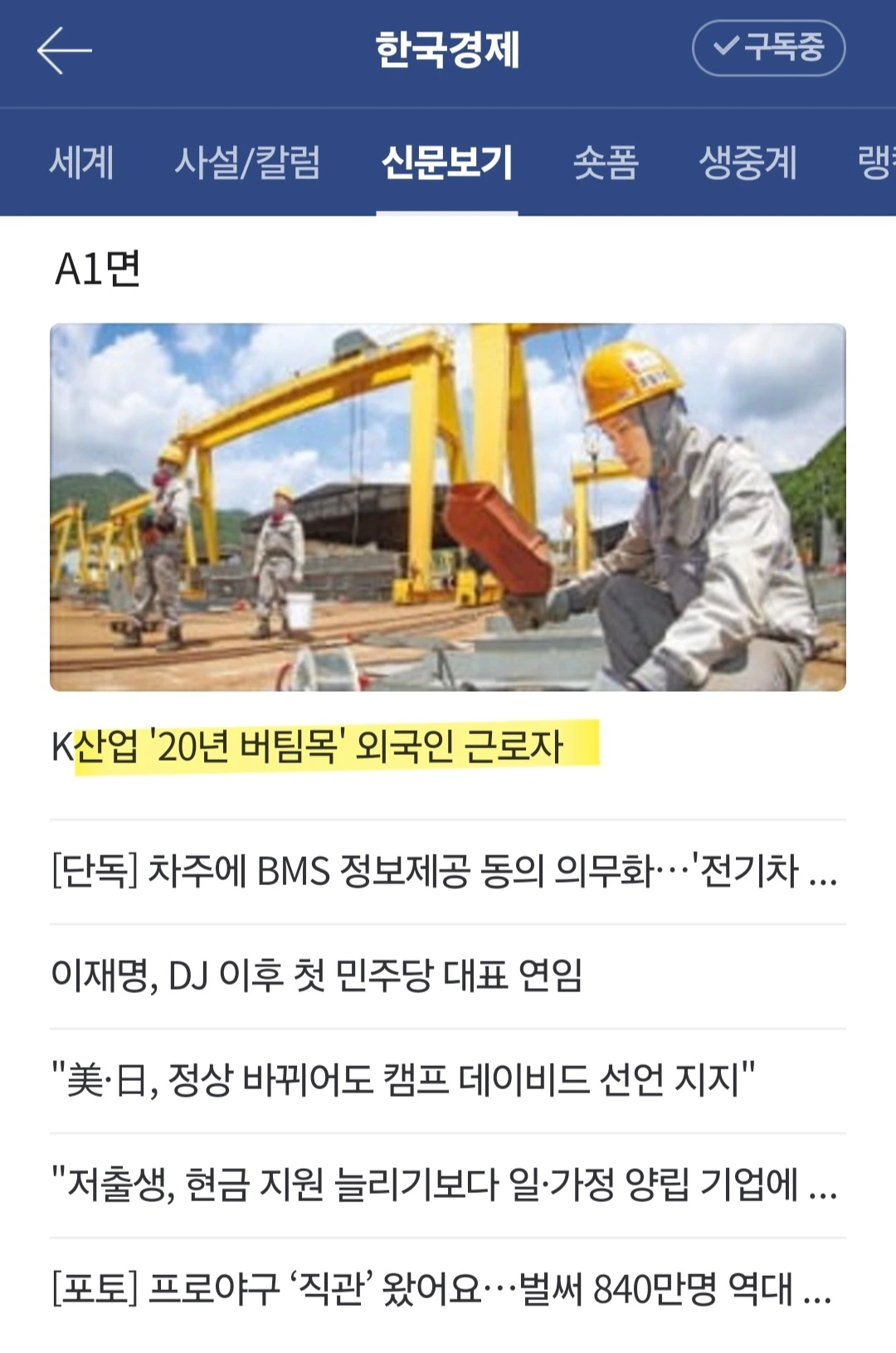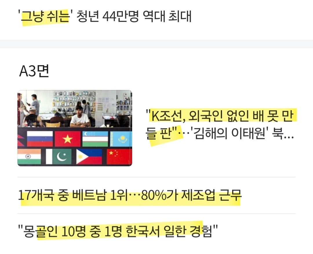 한 바닥 가득 외국인 근로자 기사를 쓴 바로 옆면에 우리나라 청년들 기사가 같이 올랐다.