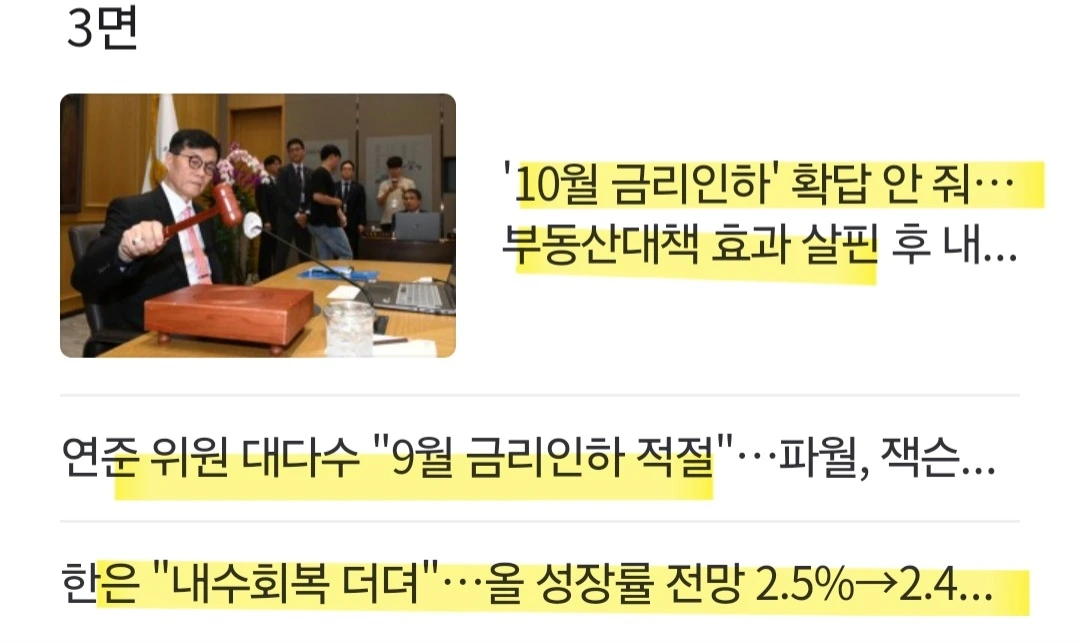 기준금리를 낮추려니 부동산이 문제. 정부에선 한은에게 눈치 주고 미국은 낮출 것 같고. 이래저래 한은은 시달리는 중.