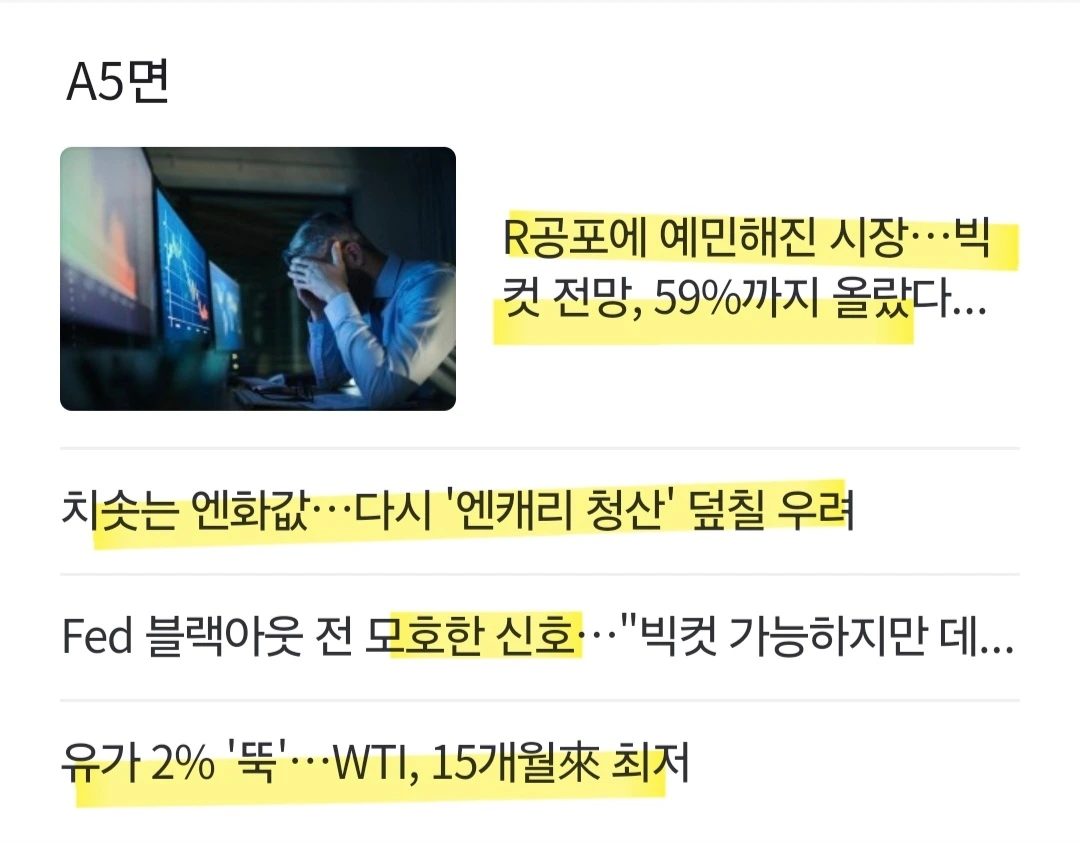 [경기침체 공포] R(recession·경기 침체)’의 공포. 고용시장을 바라보는 시각에 따라 빅컷(기준금리 한 번에 0.5%포인트 인하)과 베이비컷(0.25%포인트 인하) 전망이 요동. 관건은 금리 인하 수준. 통상 주요국 중앙은행은 피벗 시점에 금리를 한 번에 0.25%포인트씩 조정한다. 하지만 고용 시장이 악화하면서 0.5%포인트 인하할 것이란 관측도. “경기 침체를 가리키는 명백한 데이터에 의한 것이 아니라면 빅컷은 오히려 시장을 더 불안하게 만들 수 있다” “Fed 역시 시장의 과도한 변동성을 우려하고 있을 것”