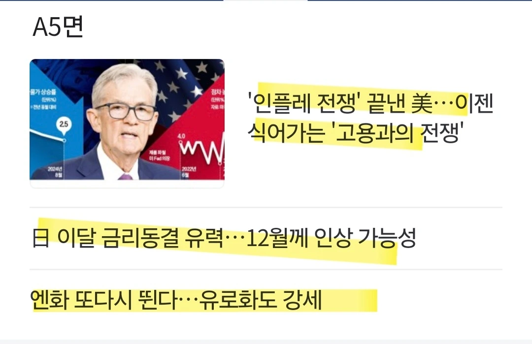 [이유] 실제 한 때 9%가 넘었던 소비자물가지수(CPI) 상승률은 Fed의 목표치인 2%에 가까워지고 있지만, 미국 노동시장은 실업률이 상승하는 등 경색 조짐. Fed 내부에선 더 이상 늦기 전에 경기 둔화를 막기 위한 선제 대응에 나서야 한다는 우려.