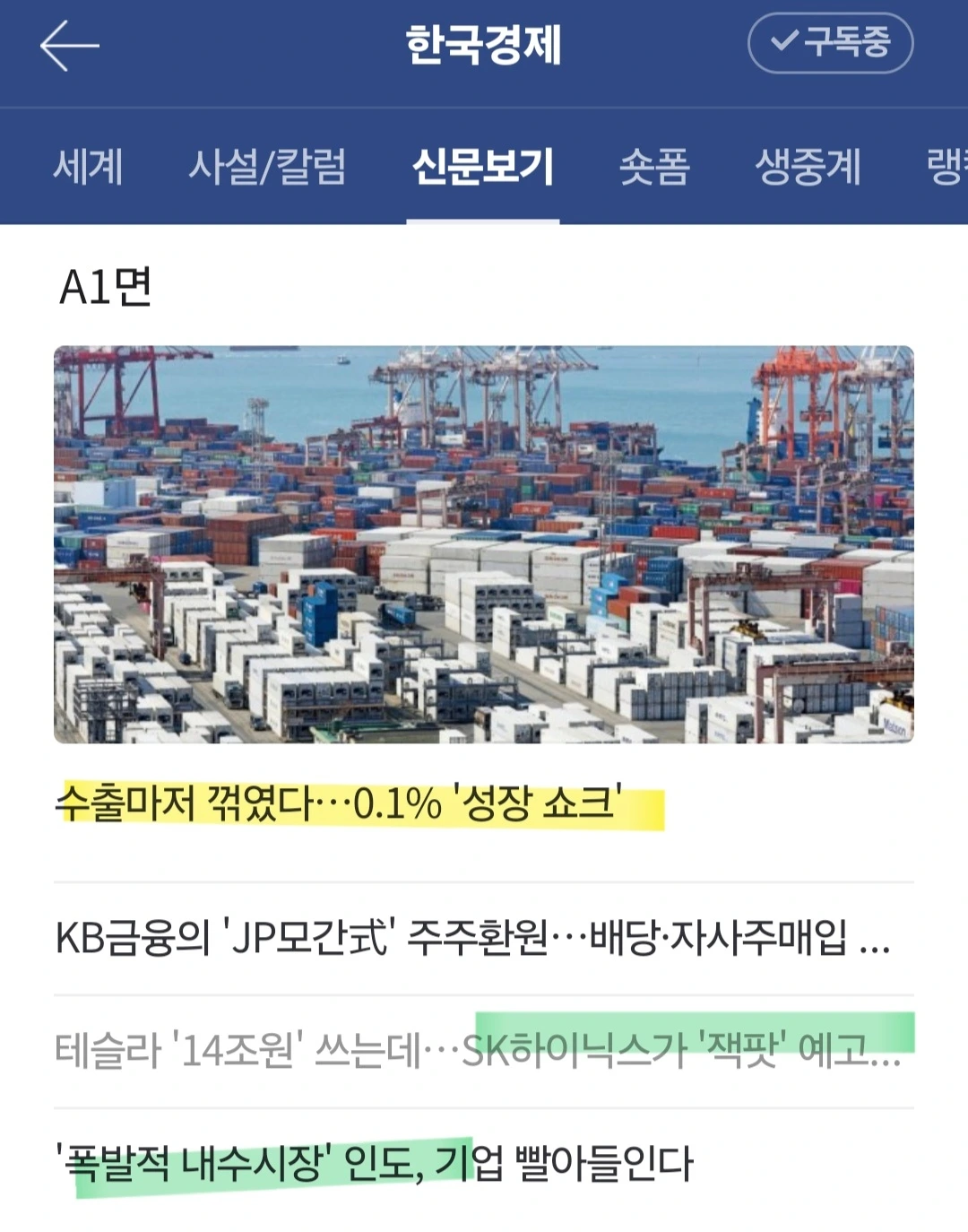 [요약] 3분기 한국 경제 0.1% 성장. 내수가 다소 회복했지만 경제를 지탱하던 수출이 뒷걸음질. 당초 예상한 3분기 성장률 0.5%에 크게 미치지 못하는 ‘성장 쇼크’가 나타나면서 연간 성장률 전망의 상당폭 하향 조정 불가피