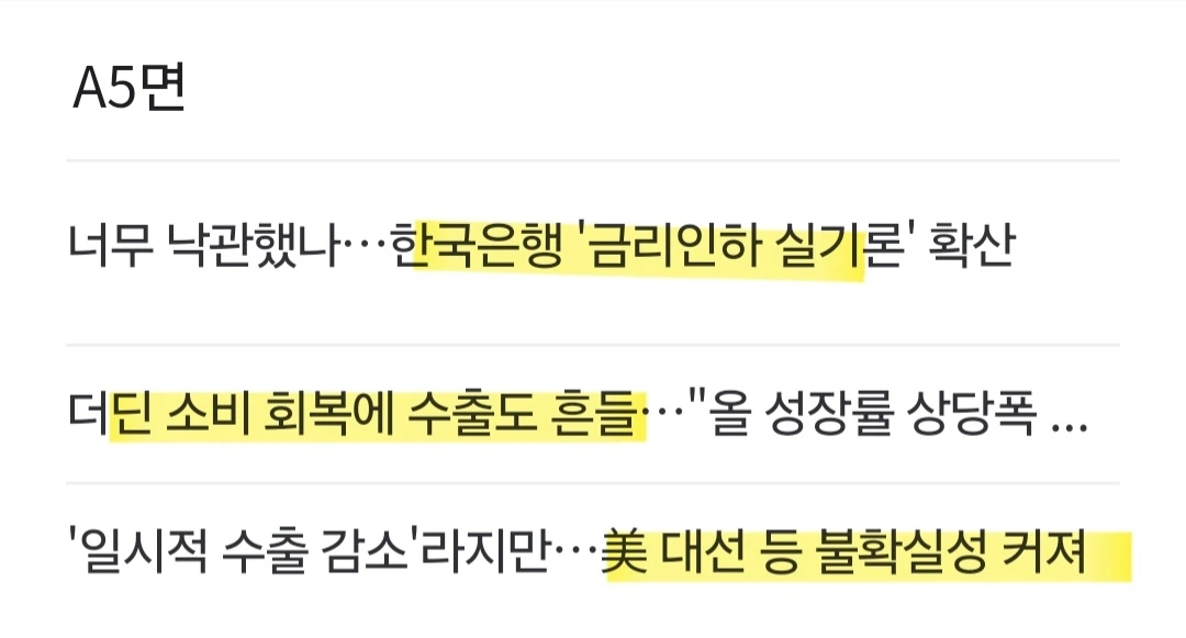 [대외 환경] 올해 3분기 수출이 예상보다 부진하면서 한국 경제의 버팀목이던 수출 증가세가 둔화할 것이라는 우려 증가. 정부는 자동차 부문 파업 등 일시적 요인이 겹친 결과로 보지만, 미국 대통령 선거와 중동 긴장 고조 등 대외 불확실성이 커졌다는 점에서 촉각