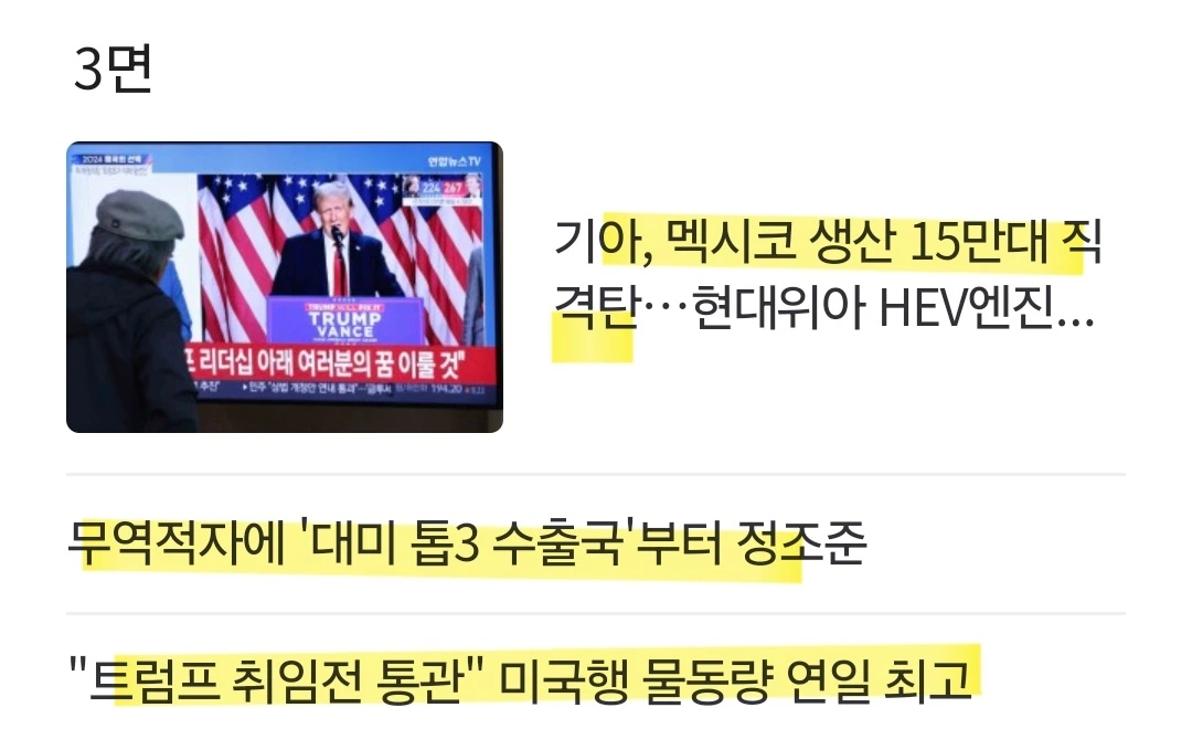 [자동차업계] 25%의 관세 부과 소식을 듣고 순식간에 얼어붙은 곳은 국내 자동차 업계. 현대차와 기아, 한국GM을 비롯한 국내 완성차 업체들은 수출에서 대미 의존도가 50% 초과. 미국·멕시코·캐나다협정(USMCA)으로 사실상 무관세 혜택을 보고 있던 멕시코에도 관세 폭탄. 멕시코에 진출한 기아·BMW· GM 등에 납품하기 위해 현지에 진출한 한국 자동차 부품 업체들도 같은 피해를 받을 수밖에