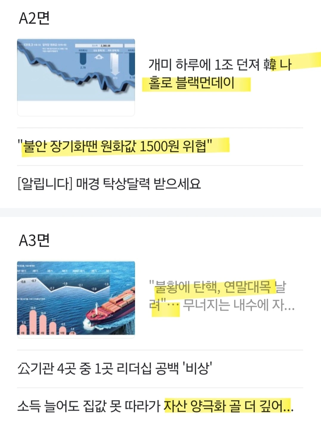 [요약] 성장, 고용, 소비, 분배 등 한국 경제 모든 부문이 심각한 위기 상황. 수출마저 흔들. 여기에 계엄·탄핵 사태가 찬물. 계엄 사태 이후 이날까지 코스피와 코스닥은 4거래일 동안 시가총액이 총 144조원 넘게 증발. 11월 수출의 전년 동월 대비 증가율은 1.4%로 작년 9월(-4.4%) 이후 가장 낮은 수치. "내년 한국의 성장률 전망치를 시장 평균보다 낮은 1.8%로 유지하지만 리스크는 점점 더 하방으로 치우치고 있다". 신규 구인 인원은 16만5000명으로, 11월 기준으로 금융위기 직후인 2009년 이후 가장 적음. 양극화 심화.