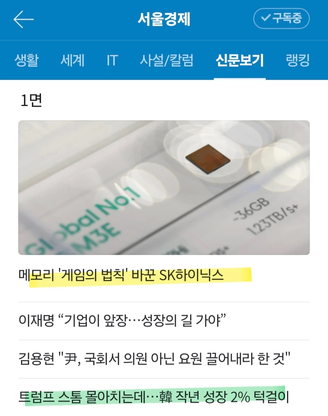 [배경] 메모리반도체 업계의 상식을 뒤집은 결과. 지난해 메모리 시장은 정보기술(IT) 기기의 수요 부진과 중국 메모리 업체들의 물량 공세로 인해 하반기 이후 약세 = 사이클 부진. 하지만 SK하이닉스는 HBM 등 인공지능(AI) 메모리를 무기로 업황 다운턴을 극복.