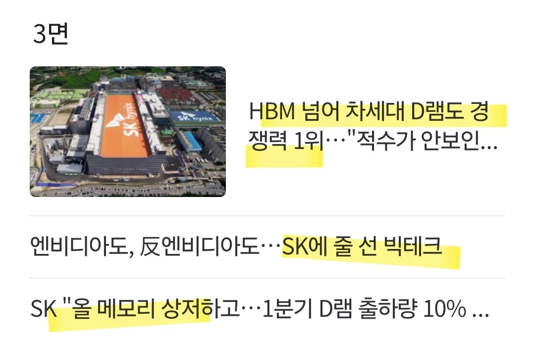 [주력상품] 주력 상품인 D램에서 HBM이 차지하는 매출 비중은 40%. HBM 매출은 지난해 전년 대비 4.5배 이상 늘었고 올해도 100% 이상의 성장이 예상. 선단 제품의 생산을 늘리는 대신 더블데이터레이트(DDR)4 등 범용 제품의 생산 비중은 크게 축소. 지난해 20%에 달했던 범용 D램의 생산 비중은 올해 한 자릿수로 줄이기로. 빅테크 업체들의 러브콜을 받고 있는 HBM4 12단 제품은 연내 공급을 시작하고 HBM4 16단은 내년 하반기부터 공급