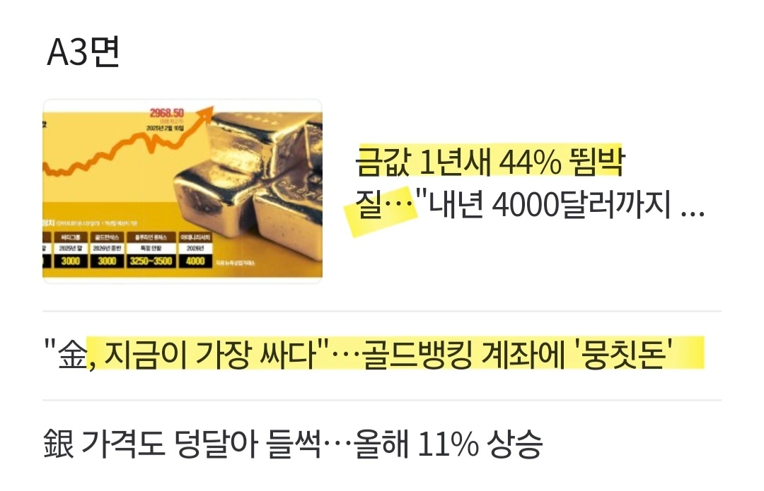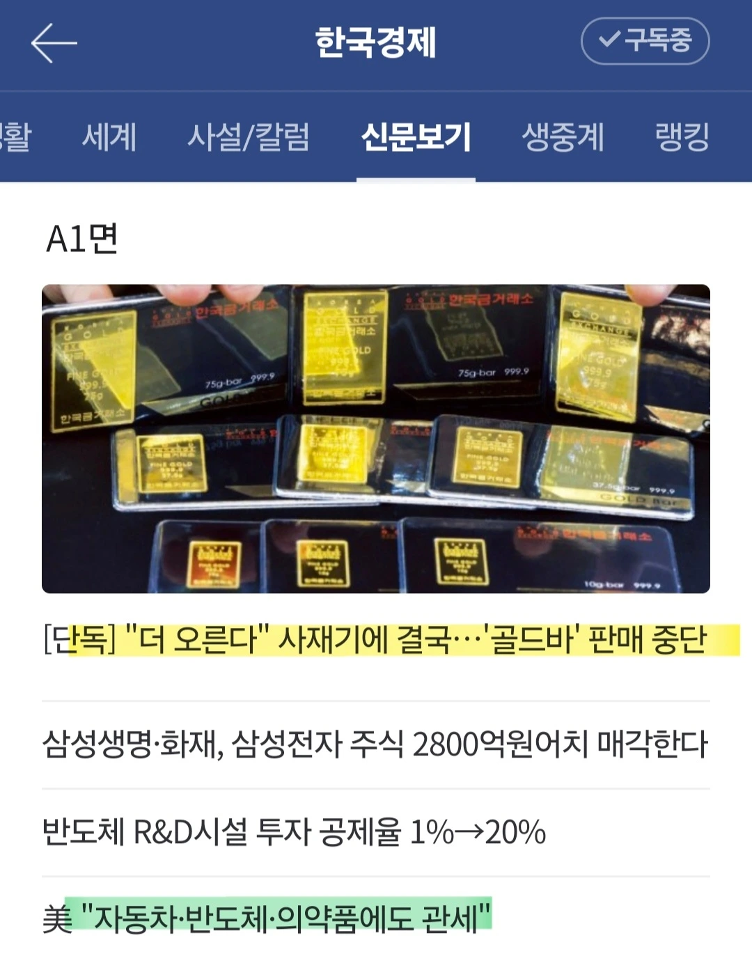[요약] 한국조폐공사가 골드바 판매를 전격 중단하기로. 트럼프발(發) 관세 폭탄 여파로 대표 안전자산인 금 수요가 폭발적으로 늘어나 공급에 차질이 생긴 탓. 역대급 금값 랠리에 시중은행 골드뱅킹(금 통장) 계좌는 최대치. 국제 금값이 사상 처음으로 트로이온스당 ‘3000달러 시대’를 눈앞에 둔 상황에서 포모(FOMO·나만 소외된다는 두려움) 현상이 심화