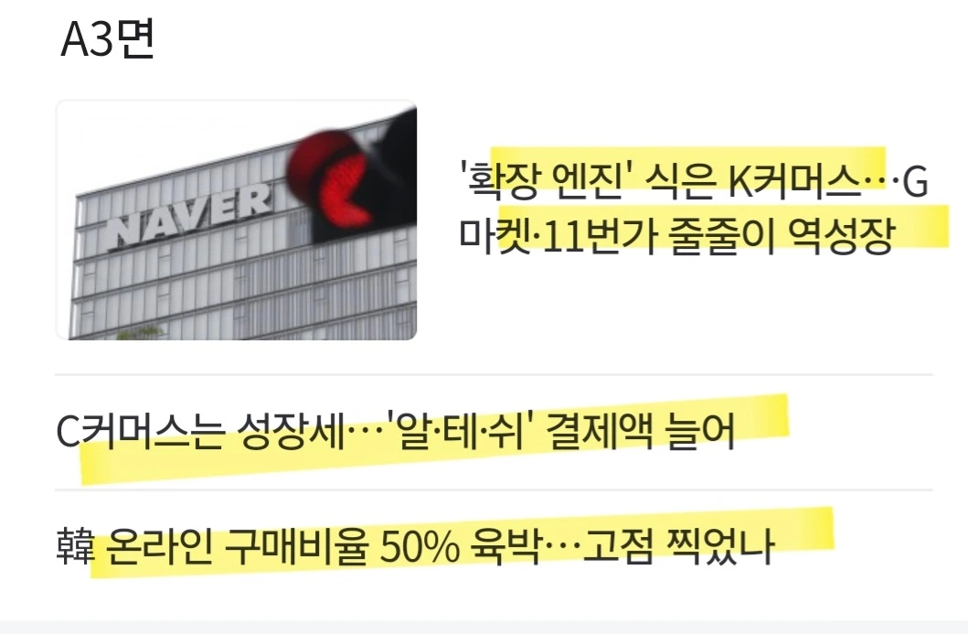 대체 데이터 플랫폼 한경에이셀에 따르면 쿠팡과 e커머스업계 선두를 다투는 네이버는 물론 3위와 4위인 G마켓과 11번가도 지난달 거래액(GMV) 추정치가 전년 대비 마이너스. 네이버쇼핑 거래액을 반영하는 네이버파이낸셜의 신용카드 결제금액은 지난달 2조5440억원으로 0.35% 감소. 네이버 관계자 “스마트스토어에서 신용카드 결제 외에 충전금, 포인트 결제 등이 늘고 있다”며 “관련 내용 등을 감안한 네이버쇼핑의 1월 거래액은 전년 대비 증가했다” G마켓과 11번가는 2023년부터 상당 기간 두 자릿수 감소율