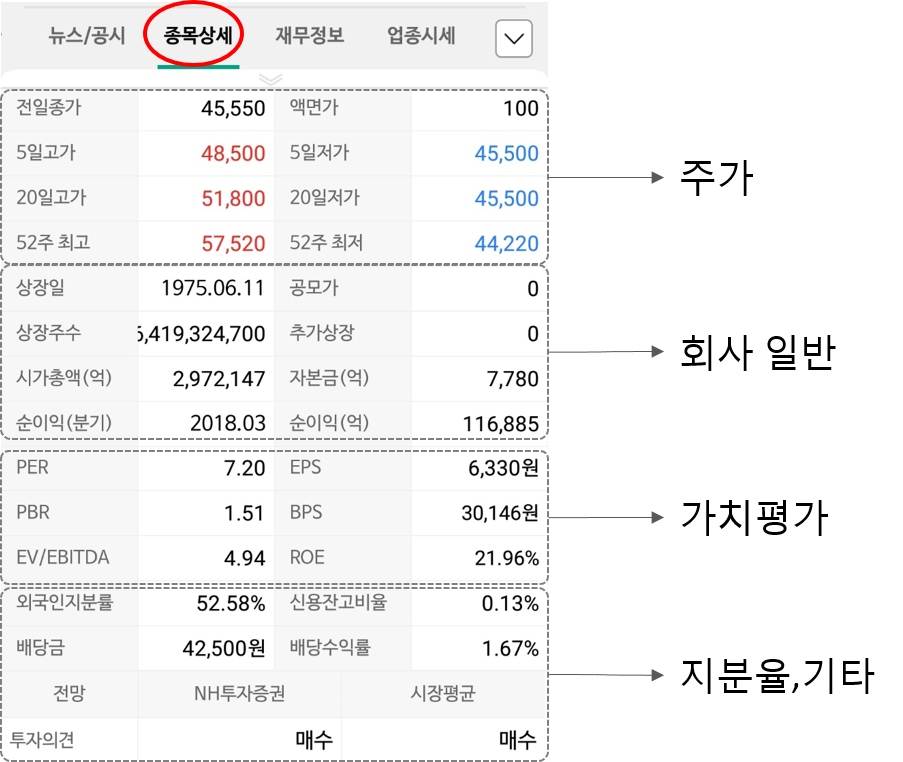 각 종목을 세부적으로 보는 것. 여기서 봐야 할 내용이 여러 개가 있지만 그중에서 PER라는 게 나오니 그것만이라도 알아두면 좋겠어. 주식 투자할 때 많이 나오는 용어야. 주식 평가할 때도 많이 쓰이고. 여기서 가장 신경 쓸 부분은 '가치평가'라고 나와 있는 부분이야.