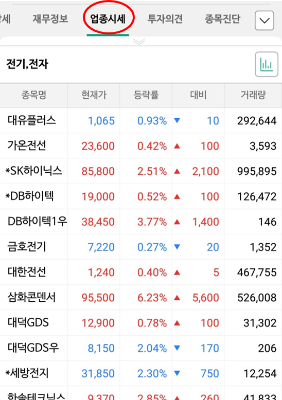 '전기/전자'로 묶인 다른 회사들 시세. 해당 주식이 포함된 '그 바닥' 시세.
