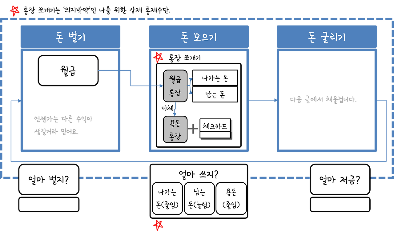 우리는 의지박약이기 때문입니다. 돈이 보이면 쓰지 않고는 못 배깁니다. 힘든 나를 위해 보상도 해줘야 하고, 반드시 무엇을 하겠다는 것은 없지만 요즘 유행하는 것들은 해보고 싶어 합니다. 그나마 다행이라면 당신만 그런 게 아니라 우린 다 똑같아요. 통장을 쪼개는 건 당신에게 쓸 수 있는 돈에 경계를 만들어서 강제로 못 쓰게 하려는 겁니다. 이자율이 높으니까, 트렌드라서, 수익률 높이려고, 그런 이유 아니에요. 당신과 나의 의지박약을 이겨내기 위한 방법입니다. 자신이 의지박약에 가깝다고 생각될수록 시도해보세요.