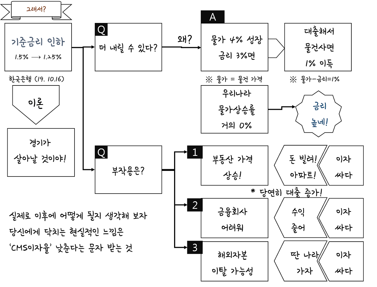 위의 개념에서 말했듯이 금리를 내리는 것은 경기를 띄우기 위한 방법이다. 그러니 '경기가 살아날 것'이라는 긍정적인 효과 말고 '부작용'은 없는지 살펴보자는 의미다. 무조건 부작용이 크다고 생각하면 안 된다.