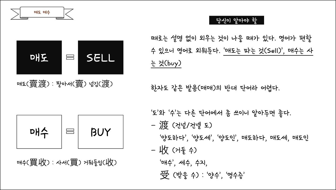 매도나 매수라는 단어는 익숙해지는 순간 헷갈리지 않을 것이다. 단어가 헷갈리는 것은 그만큼 접해보지 않아 익숙하지 않은 것이다. 많이 접하면 자연스럽게 사용하게 된다. 그러니 굳이 어렵게 설명할 필요 없다.