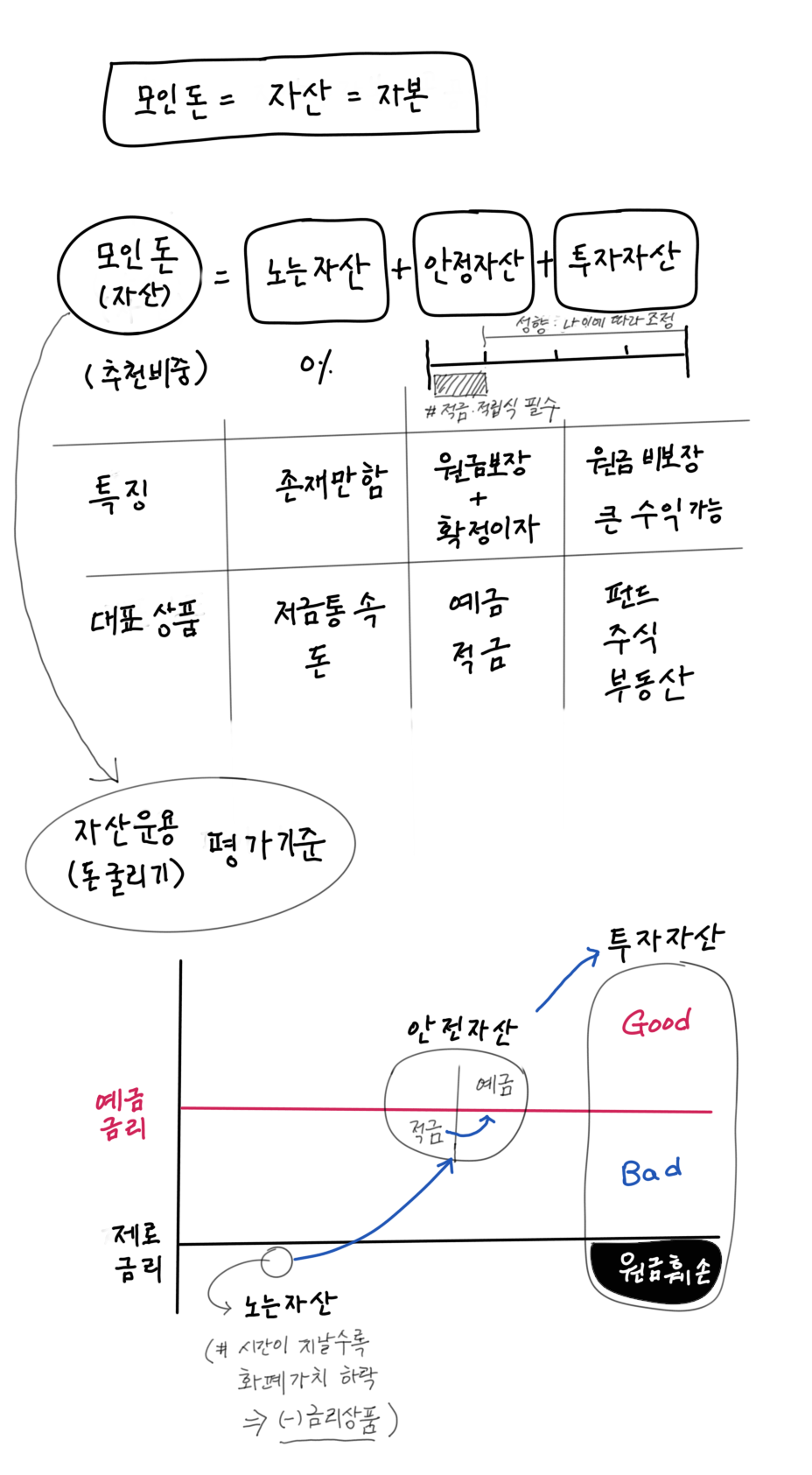 모인 돈(굴리는 돈) = 노는 자산 + 안전 자산 + 투자 자산