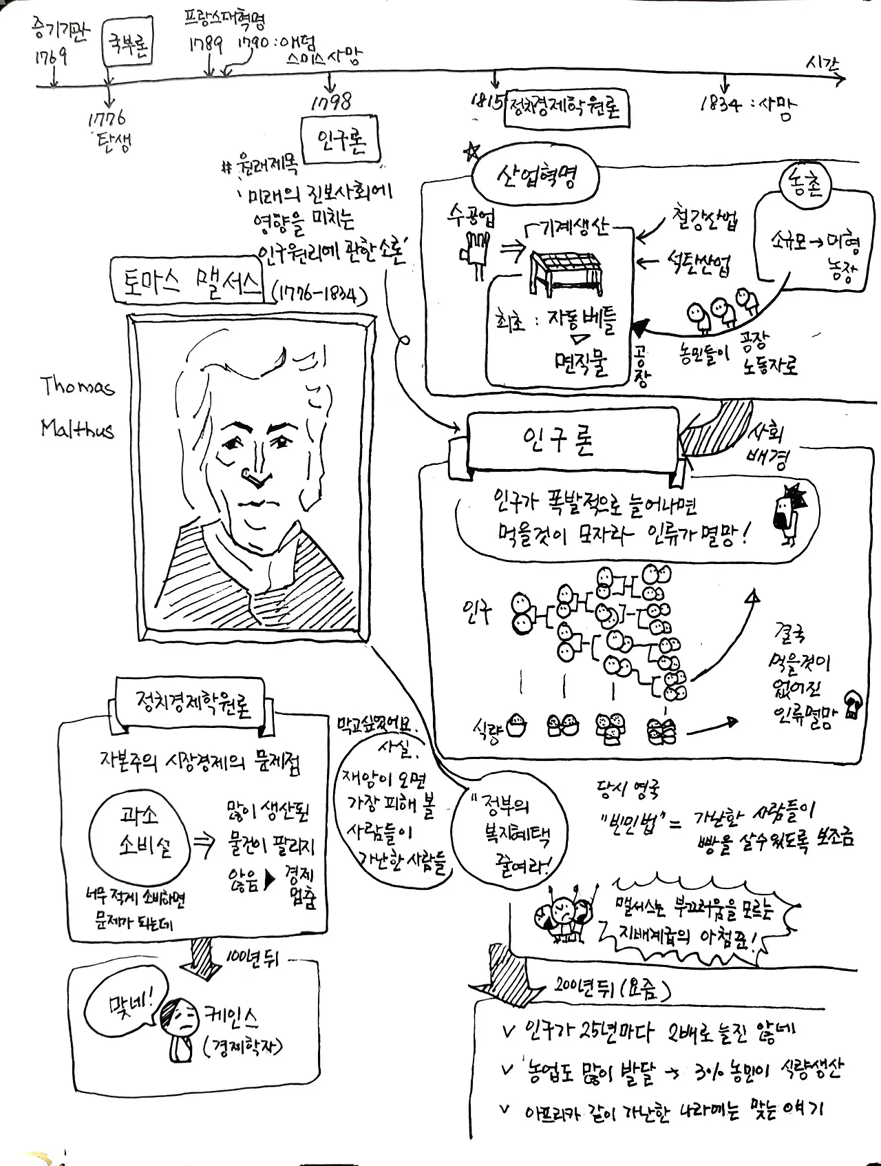 가난한 사람인 빈민을 도와주는 제도를 없애야 한다고 주장했다죠. 당연히 사람들은 난리를 쳤을 겁니다. 부자들에게 아첨하는 사람이라고 비난을 했답니다. 저도 그랬을 거예요. 사실, 맬서스는 가난한 사람을 굶겨 죽이자는 의미로 빈민법을 없애자고 한 것이 아니라 정말 식량이 없어지는 상황이 오면 제일 먼저, 제일 크게 고통받는 계층이 가난한 사람들이라 인구를 줄여야 한다는 주장을 세게 했다는 겁니다. 아무리 설명해도 '나쁜 사람'이라고 말하는 게 더 쉽긴 합니다.
