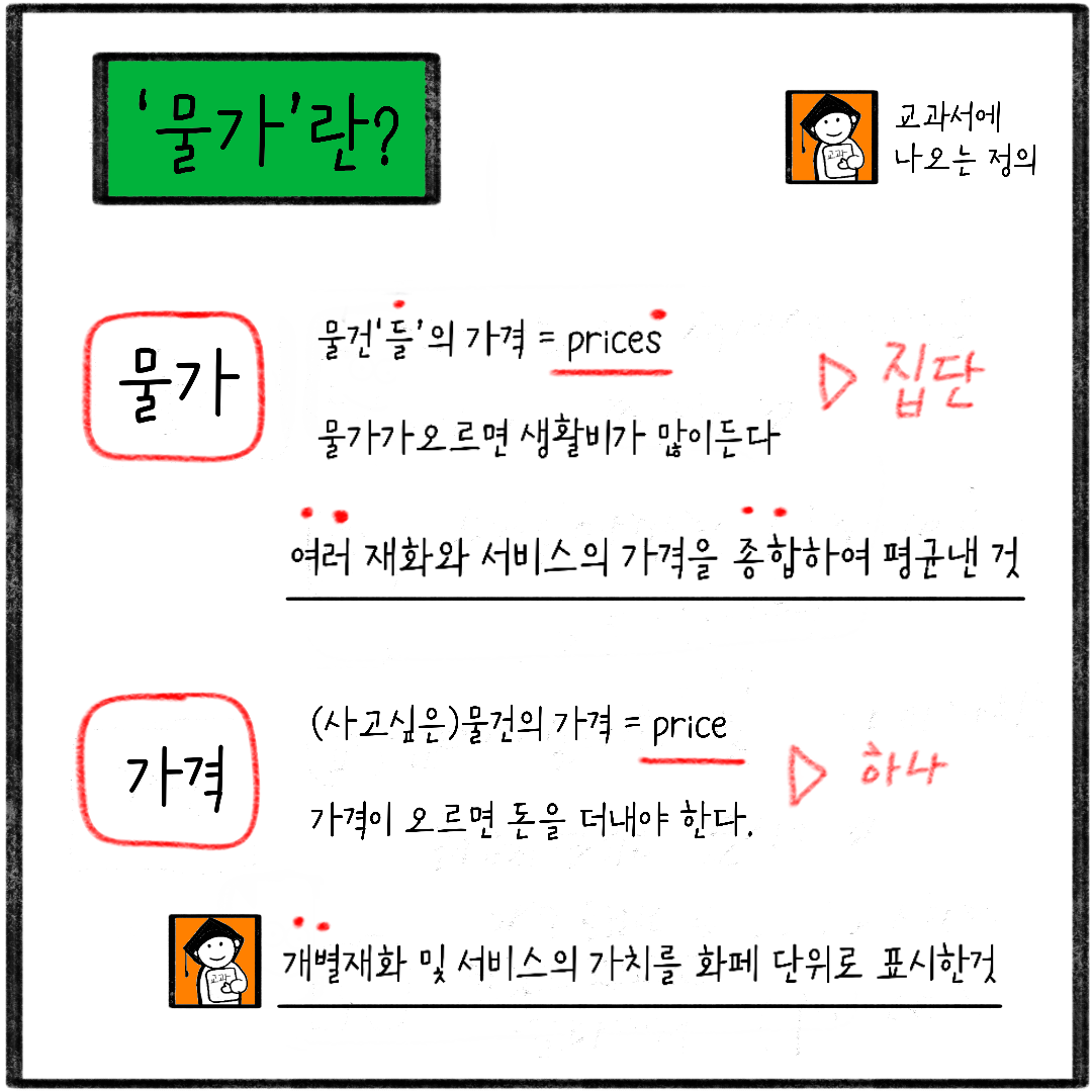 '물가'는 개별 물건이나 서비스들을 묶어서 표현한 가격입니다. 가격의 가격이라고 볼 수 있죠.