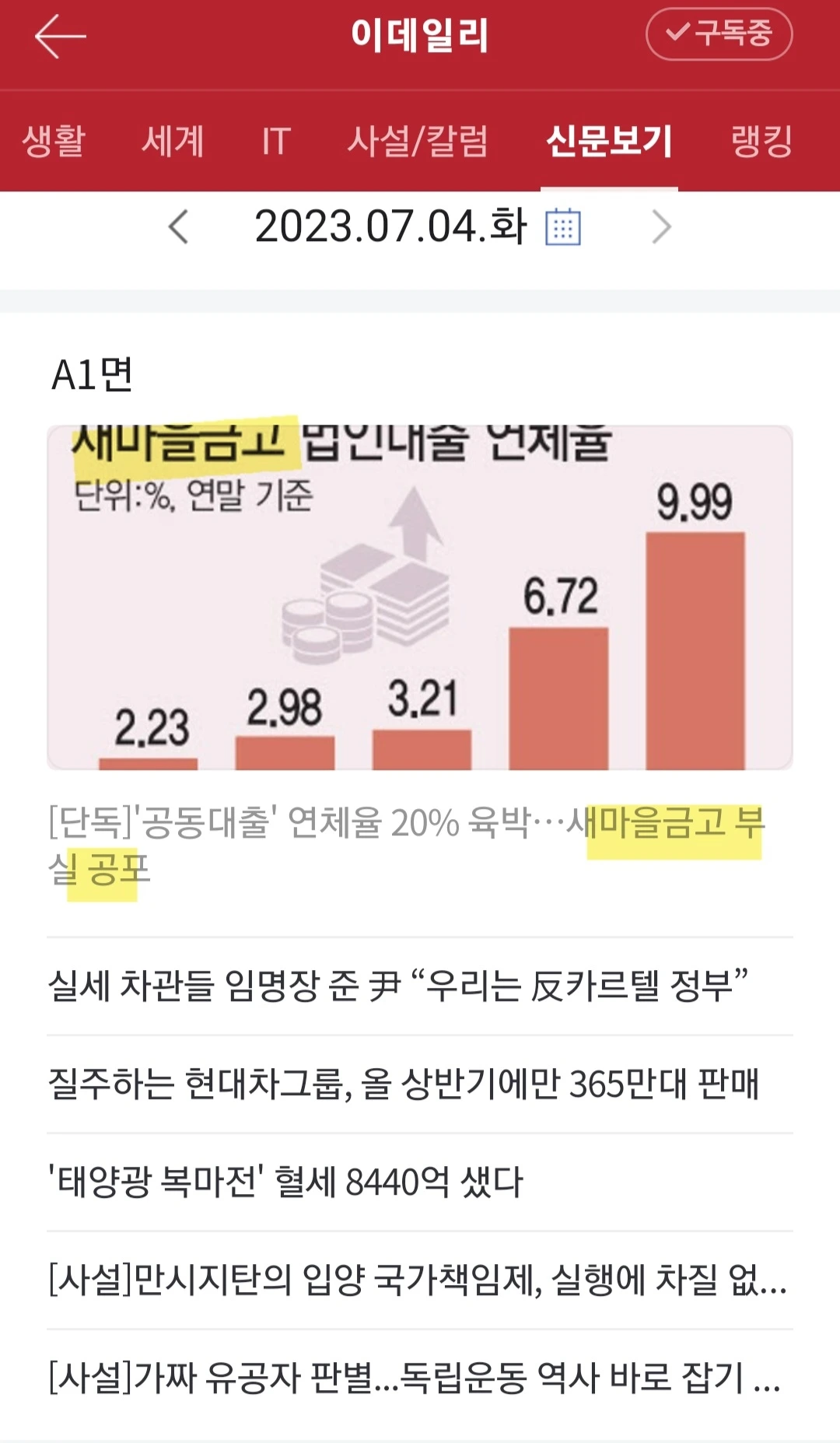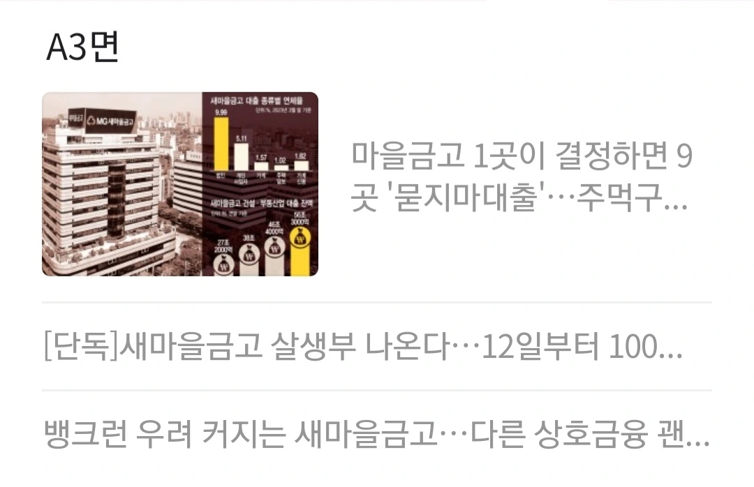 새마을금고의 부실은 다음 순위인 저축은행의 부실로. 저축은행의 부실은 1금융권으로 번질 수 있기 때문에 주의 깊게 봐야 한다. 사실, 개인입장에선 예금도 5천만원까지 보장해 주고 별다른 금융상품도 없어 개별 새마을금고 부실이 발생해도 크게 신경 쓸건 없지만 마을금고를 통한 대출이 있다면 개별 새마을금고 상황에 관심을 좀 가져야