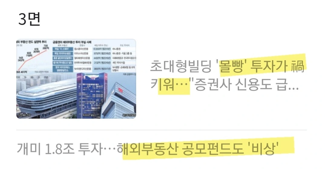 [영향] 한국신용평가에 따르면 주요 증권사 26곳이 보유한 해외 부동산 투자 자산은 총 15조 5000억 원. 특히 대형 증권사의 자기자본 중 24%가 해외 부동산과 부동산 담보 대출, 우발 부채로 구성. 한신평은 “하반기 증권사들의 우발 부채와 해외 대체투자 부실 위험에 따라 신용도가 떨어질 수 있다”