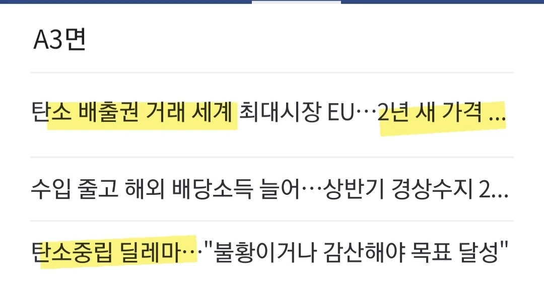 (요약) 국내 탄소배출권 가격이 사상 최저 수준. (겉으로) 지난해 탄소 배출량이 줄면서 기업들의 배출권 수요가 줄어든 결과. (속내는) 태풍으로 포스코 공장 가동이 중단되고 석유화학 업종이 불황을 겪은 데 따른 일종의 ‘착시효과’