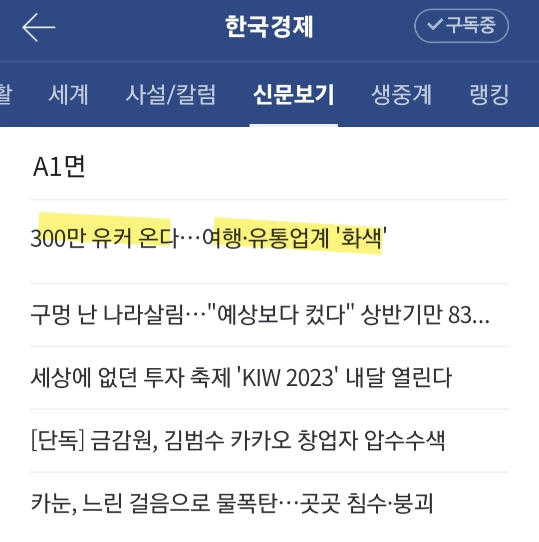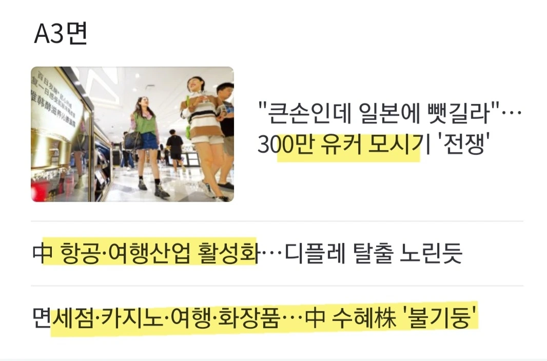 (요약) 중국 정부 6년 넘게 금지해 온 중국인의 한국행 단체여행을 전면 허용. 연간 800만 명에 달하던 유커(중국인 관광객)의 한국 관광이 재개되면서 국내 관광·유통·화장품업계에 ‘중국 특수’ 기대. 주식시장에서도 중국 관련주가 무더기 상한가