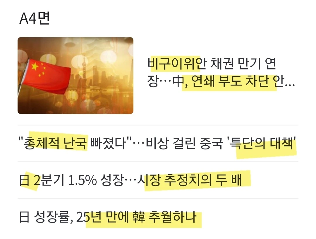 (중국 부동산) 중국 부동산개발 업체의 연쇄 디폴트(채무불이행) 우려. 중국 1위 부동산 개발업체 비구이위안(컨트리가든). 지난 6일 만기가 돌아온 10억달러(약 1조3160억원) 규모 채권 2종에 대한 이자 2250만달러를 지급하지 못해 디폴트 위기에 빠진 상태. 위안양그룹(시노오션)이 채권 이자를 지급하지 못했고, 완다그룹도 디폴트 위기라는 소식이 전해지는 등 중국 부동산 시장 전반에 도미노 붕괴 우려