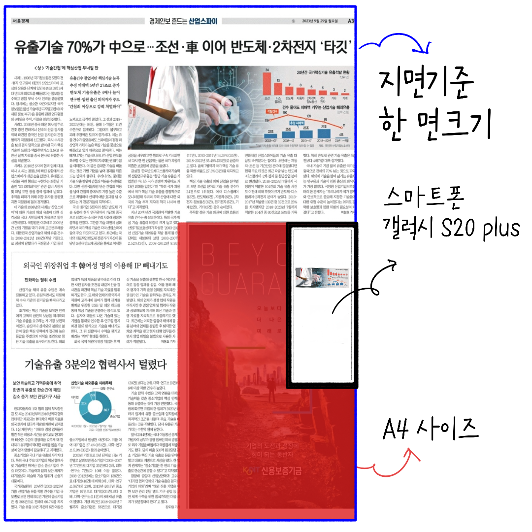 오늘 내용과 관련된 TMI를 해드린다면, 지면 사이즈는 보통 '대판'이라고 부르는 크기를 기준으로 했습니다. 우리나라 신문은 보통 대판 크기입니다. 알려진 신문 중에 대판이 아닌 신문은 중앙일보입니다. 중앙일보는 대판보다 작고, 타블로이드 사이즈보다 큰 판형을 사용합니다.