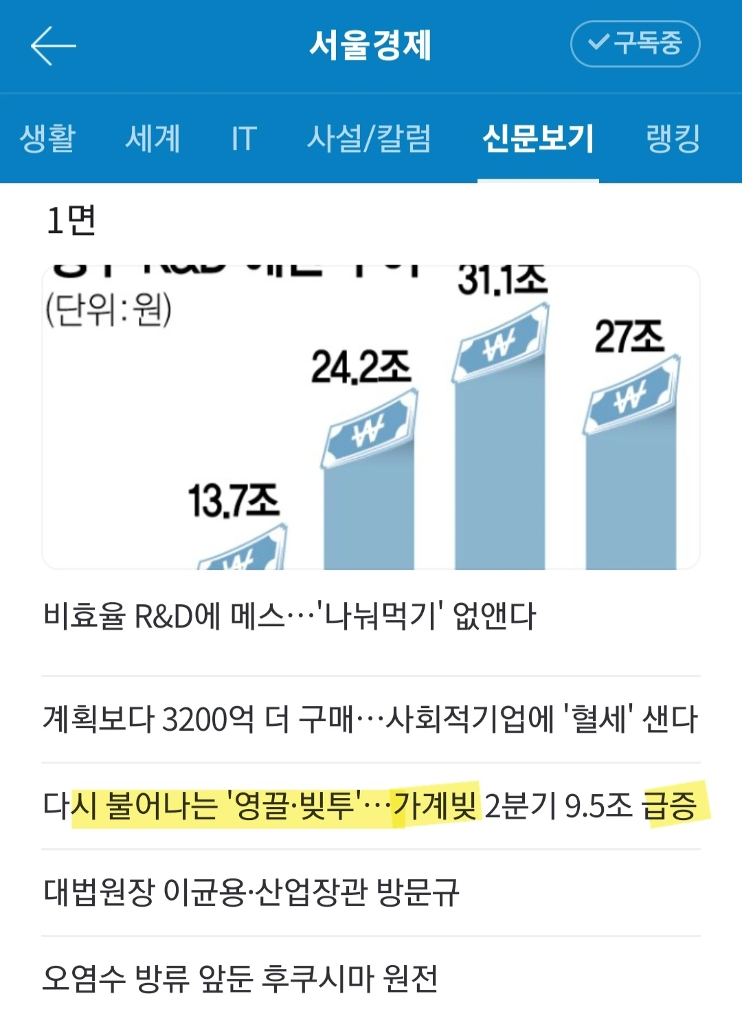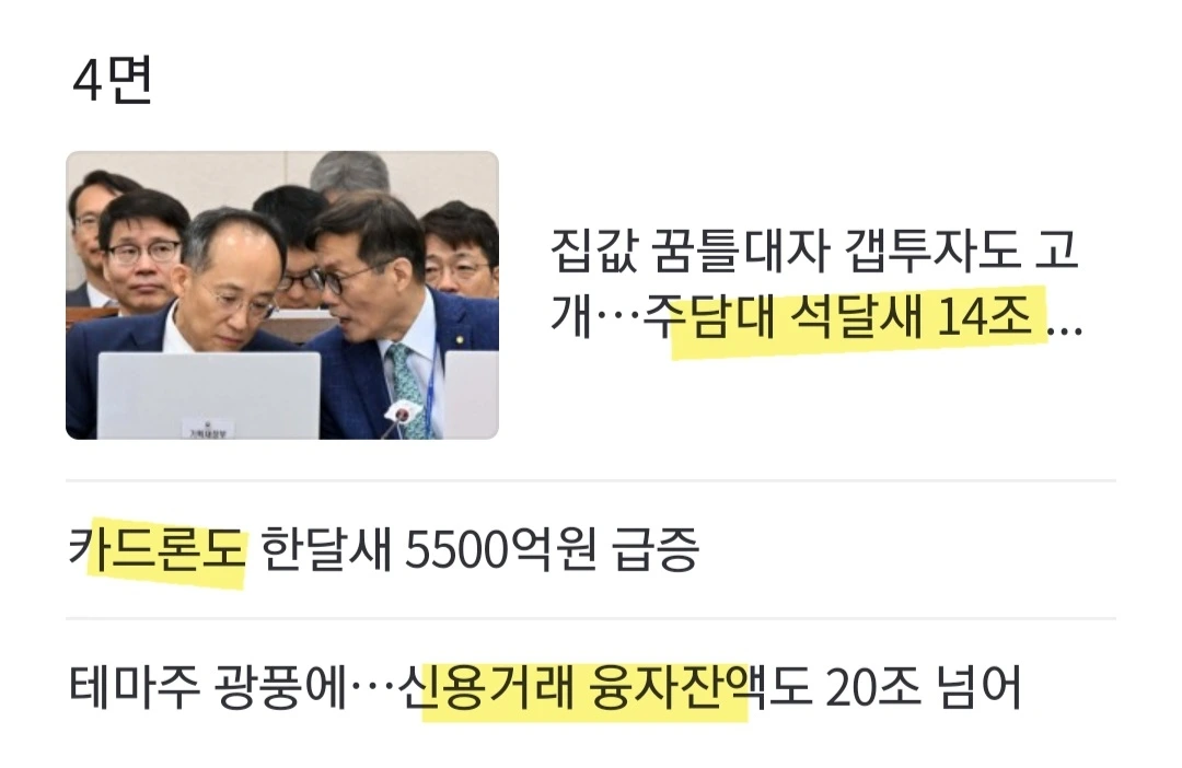 (요약) 고금리와 경기 불황에도 빚을 내 집을 사거나 주식에 투자하는 이들이 늘면서 올해 2분기 가계부채가 3개 분기 만에 증가세로 (세부) 집값 상승 기대감으로 주택담보대출 역대 최대치/주식 신용거래도 가파르게 증가.