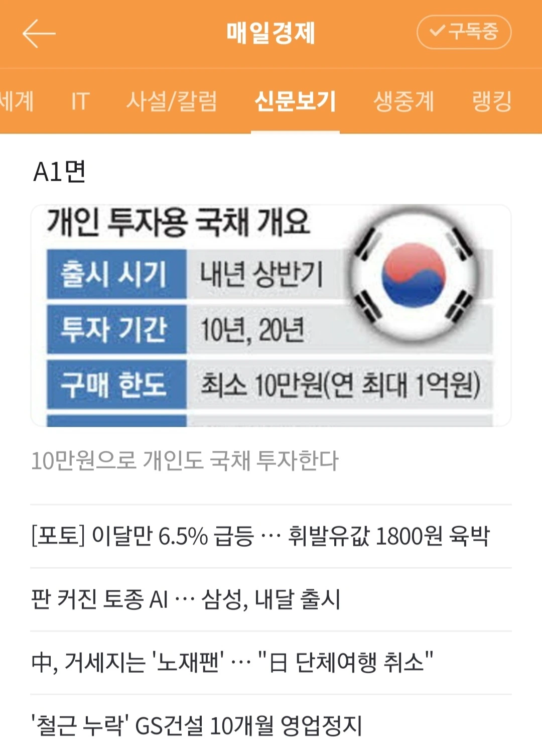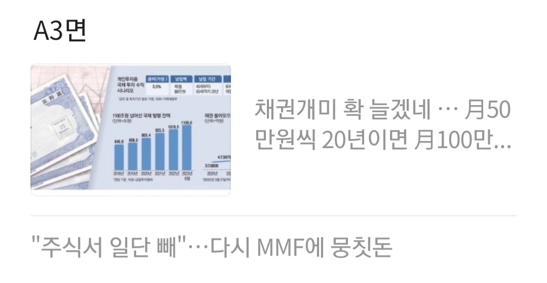 (요약) 내년 상반기부터 개인투자자들이 10만원의 소액으로도 한국 국채에 투자할 수 있게 된다. 개인 투자용 국채는 만기에 원금과 이자를 일괄 수령하는 원금 보장형 저축상품. 만기가 10년 또는 20년인 장기물. 국채 금리는 정부가 발행 때 시장금리를 기준으로 개인 투자용 금리를 정할 방침. 현재 금리 수준을 고려하면 3%대 중반에서 4%대 초반으로 정해질 가능성 높아