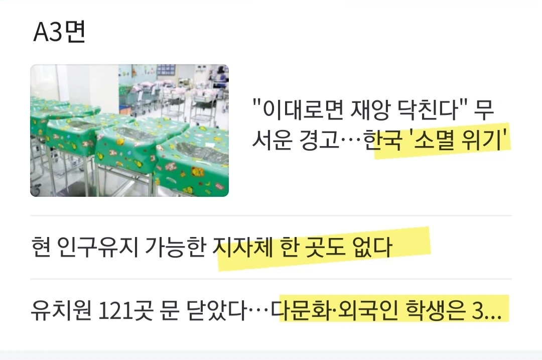 지금의 일이 반드시, 길어도 30년 안에, 영향을 끼친다. 지금 결정하는 사람들 대부분은 30년 후엔 없다. 아결정권이 없던 사람들이 고스란히 떠안아야 한다. 단기간 해법은 적극이민 수용 외엔 없다. 당연히 사회적 긴장도는 올라간다. 그리고 다문화 가정 비중이 3.5%(전국 평균)를 넘어섰다는 건 비중이 높은 일부지역의 경우 일반적인 일이 되었다는 뜻이다.