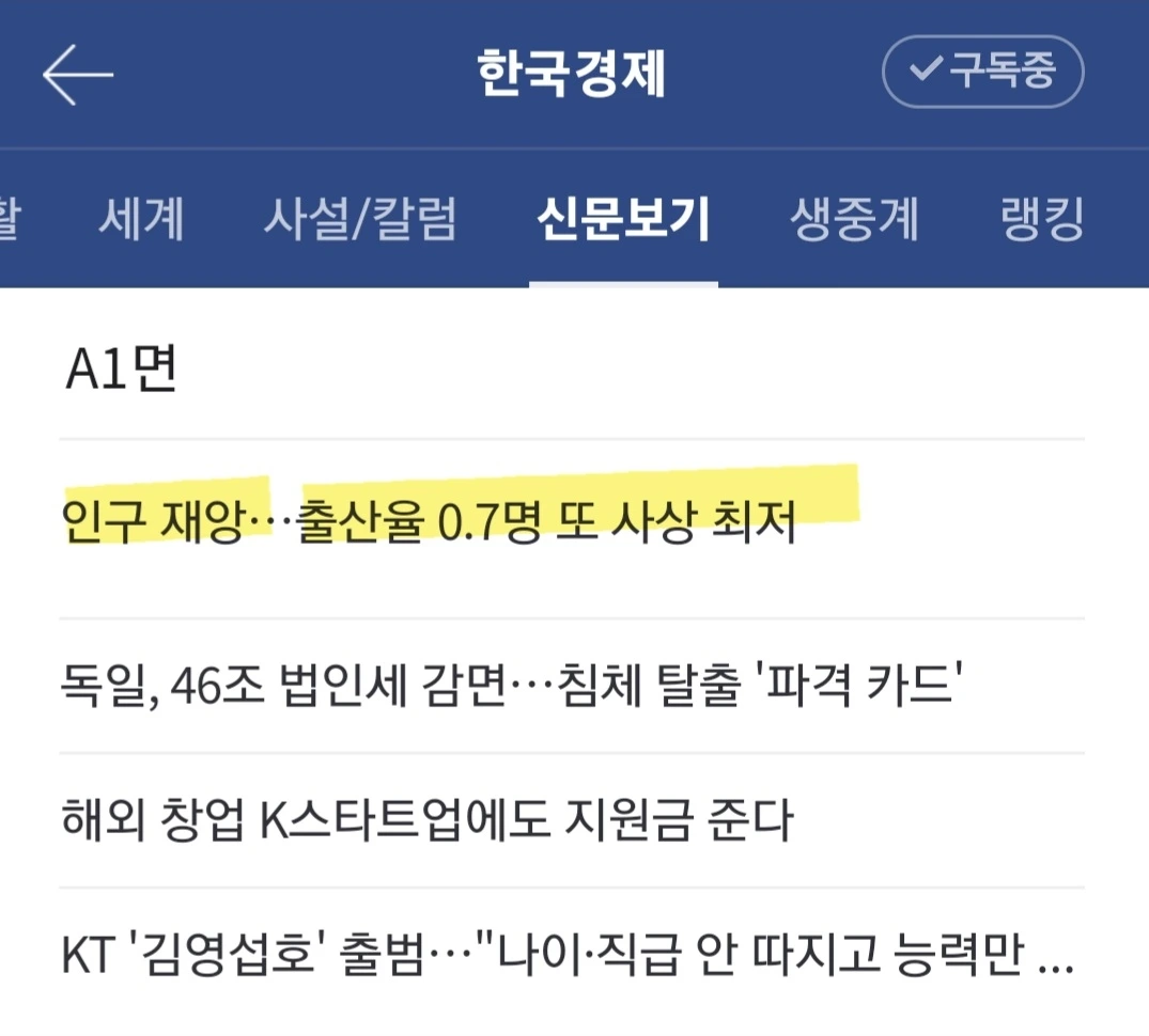 [요약] 2분기 합계출산율 0.7명(역대 최저인 작년 4분기와 같은 수준. 이대로면 내년에 출산율 0.7명 선마저 무너질 것. (통계청 ‘6월 인구동향’)