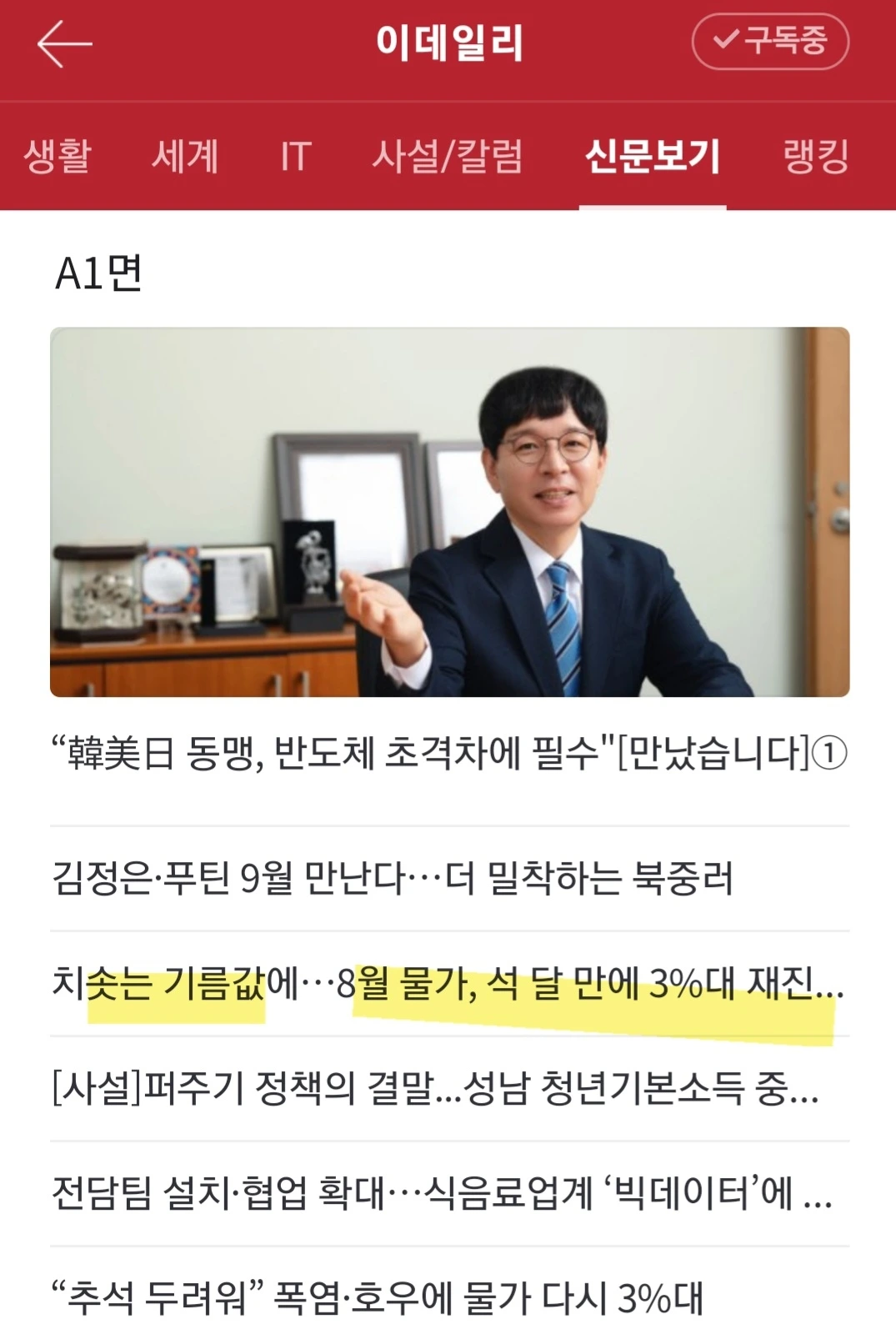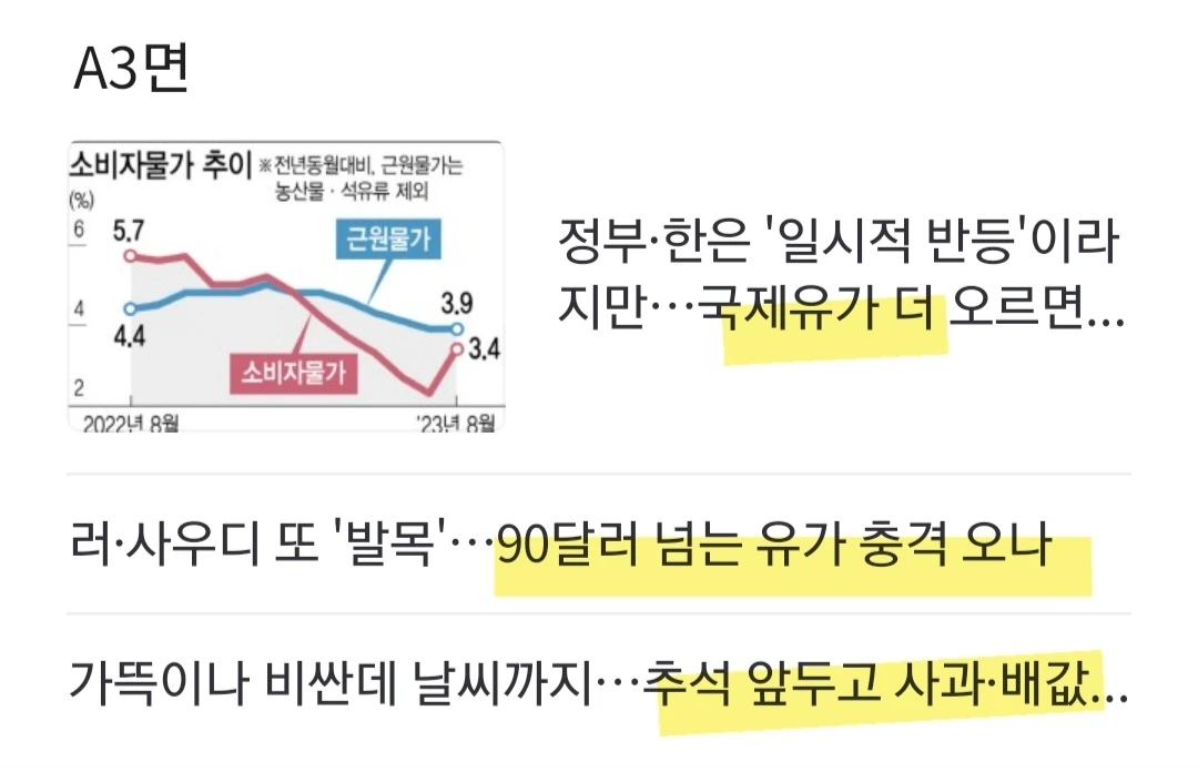 [요약] 2%대까지 내려온 소비자물가 상승률이 3개월 만에 3%대에 재진입. (이유) 국제 유가가 오르면서 기저효과까지 사라진 탓 + 폭염·폭우 등 여름철 기상 상황에 급격히 오른 과일값도 영향
