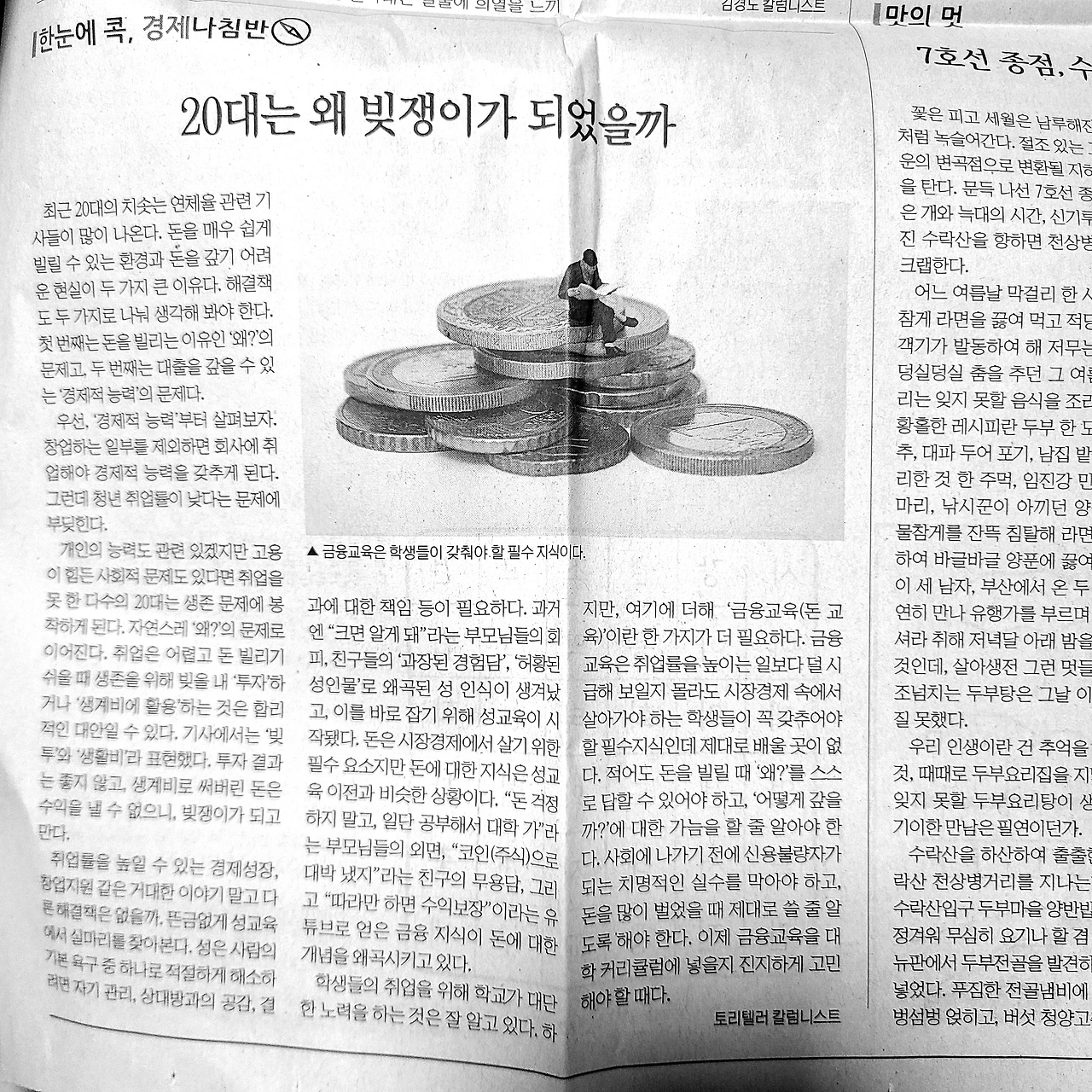 그래도 고마웠고 행복했다. 어떻게 알고 연락을 했는지, 어찌 용감하게도 모르는 사람 글을 싣겠다고 했는지, 모두가 스마트폰을 보는 세상에 종이신문 만드는 일을 하는지. 그것도 대학생이.. 아마 지금 주겠다고 한 원고료의 반을 제시했더라도 했을 것 같다.