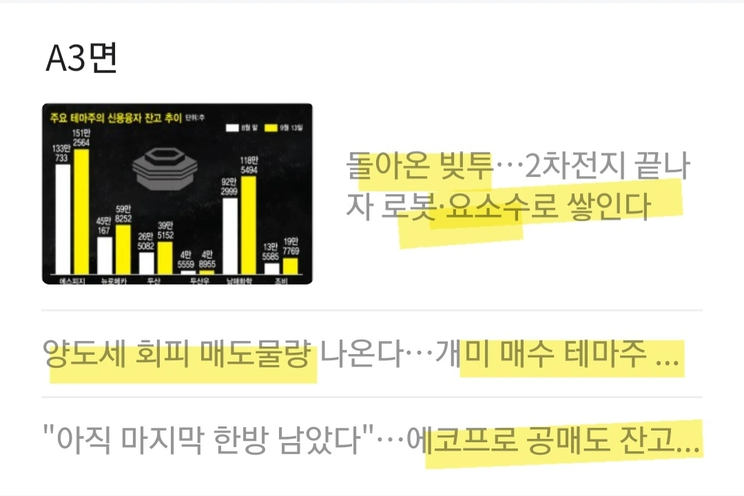 [테마의 연속] 하반기 주식시장 특징. 에코프로(2차전지) > 초전도체 , 양자컴퓨터, 맥신 관련주 > 로봇주와 두산로보틱스 기업공개(IPO) 관련 종목, 요소수. 연이은 테마주 열풍으로 현금 보유가 많지 않은 투자자들이 ‘빚투’로 시장에 접근