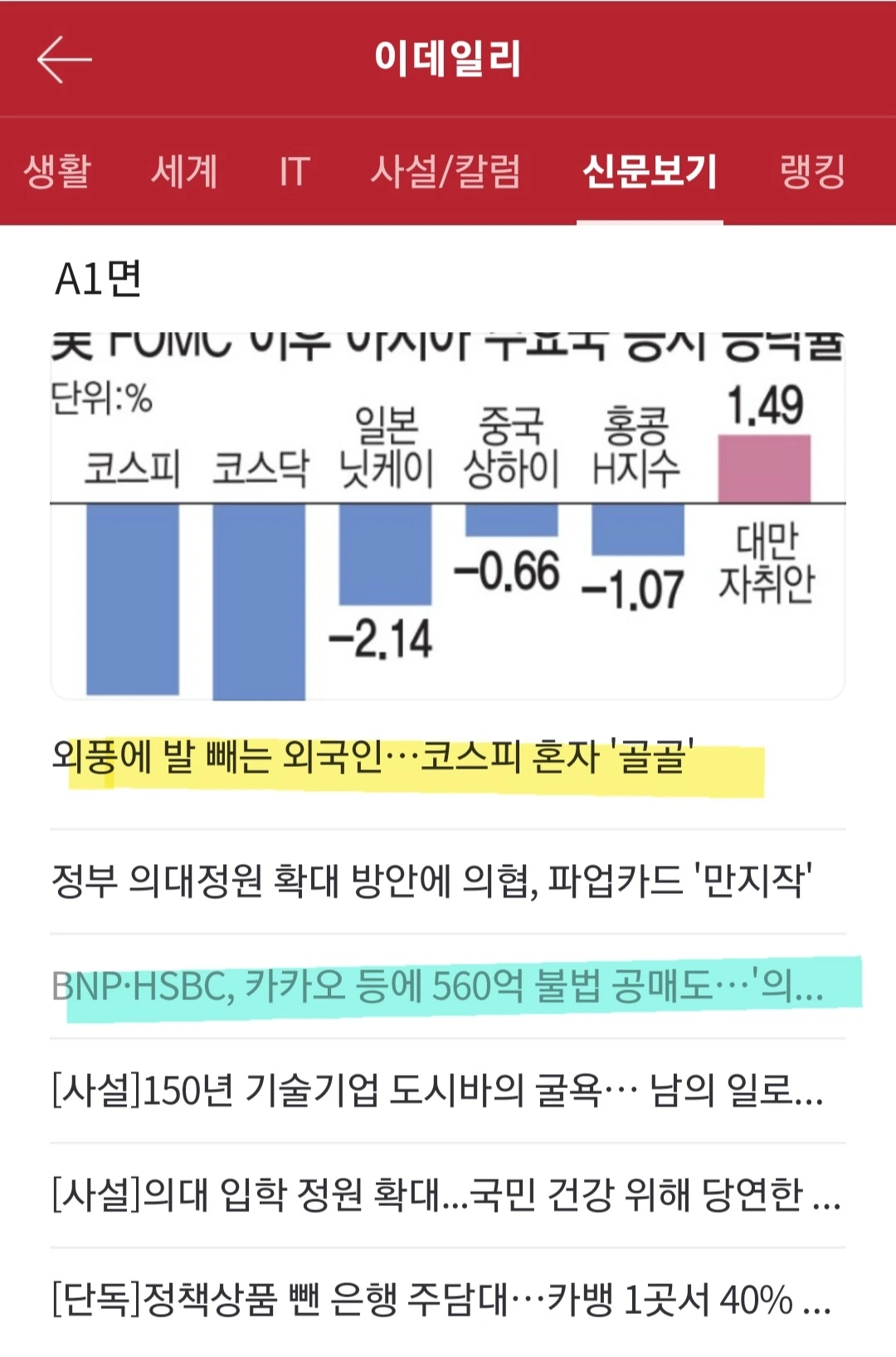 [공매도] 글로벌IB인 BNP파리바와 HSBC가 ‘국민주’로 불리는 카카오(035720)와 호텔신라(008770) 등 110개 종목에 대해 560억원 규모 불법 공매도. 핵심은 장기간 고의적이고 조직적인 불법 공매도가 최초 적발. 2021년 9월부터 작년 5월까지 국내 101개 종목(BNP파리바 기준)에 대한 불법 공매도로 수수료 수입을 챙겼다.