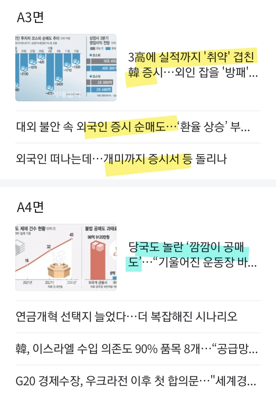 [요약] 외국인 15거래일 연속 ‘팔자’/ 코스피 지수 끌어내리는 모습. 문제는 이 같은 일본이나 중국, 대만 등 다른 아시아 국가 대비 가파른 약세 (이유) 고금리와 고환율 등에 취약하면서 투자매력은 떨어지기 때문