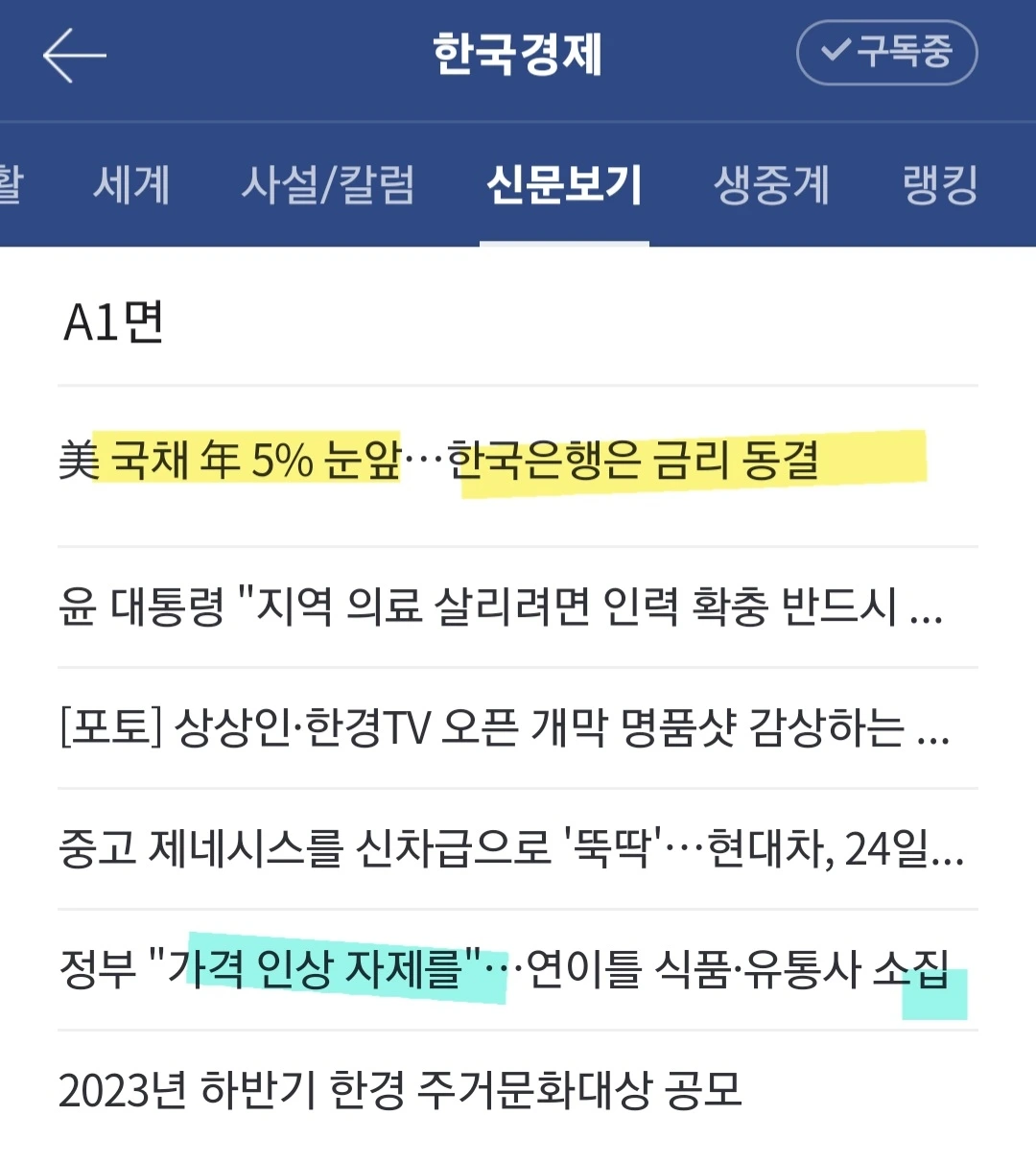 [요약] 10년 만기 미국 국채 금리 연 5% 턱밑까지 상승. (왜?) 미국 연방정부의 재정적자로 국채가 시장으로 쏟아져 나오는 데다 실물경기가 견조한 모습을 지속하고 있기 때문.