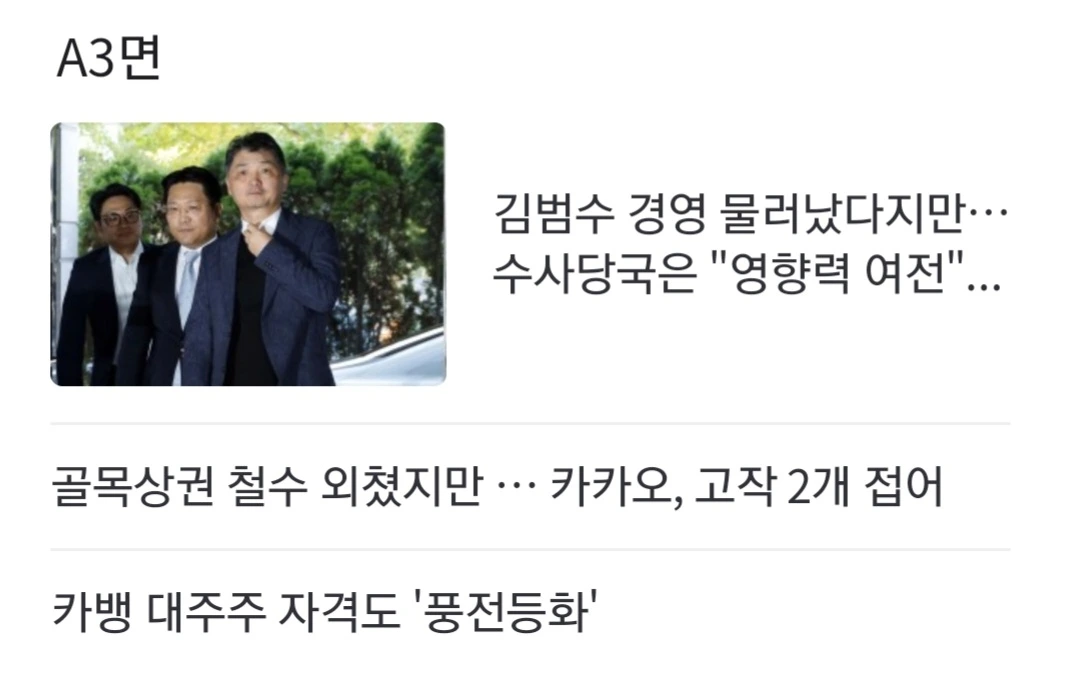[주가조작혐의] SM엔터테인먼트 시세조종 혐의로 카카오 창업자인 김범수 미래이니셔티브센터장에 대한 조사 본격화. 현재 경영 일선에서 물러난 상태이지만, 영향력이 여전하다고 보고 법리적 책임 소재 집중 추궁 (근거) SM엔터 인수 작업이 조 단위 거래(지분 39.9% 인수, 1조4000억원)이다 보니 의사 결정 과정에서 김 센터장 의중 반영
