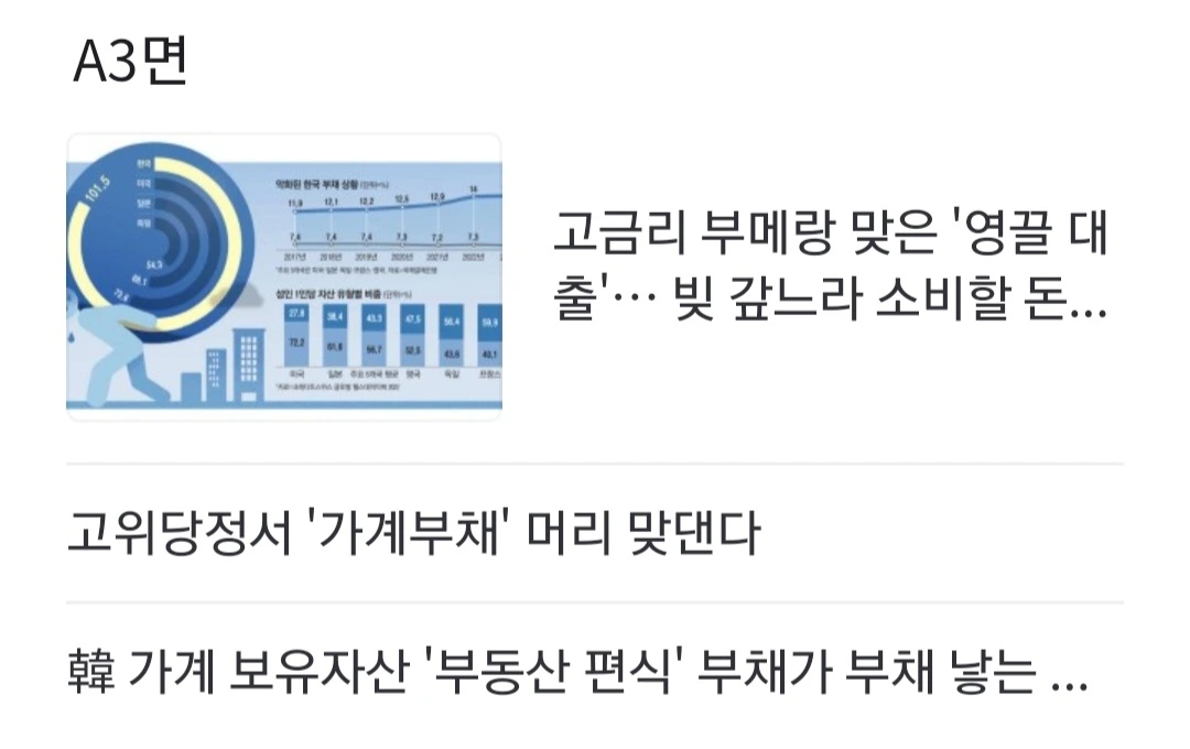 [위험요소] 가계부채가 증가한 상황에서 대출금리가 높아지고 있는 점. 고금리가 장기화+ 작년 금융권이 유치했던 고금리 예금 100조원 재유치 경쟁 = 주담대 금리 상승. 주담대 변동금리 상한이 9개월여 만에 7%대. 5대 시중은행의 주담대 변동금리는 지난 23일 기준 연 4.56~7.14%로 5개월여 만에 상단이 1%포인트 증가
