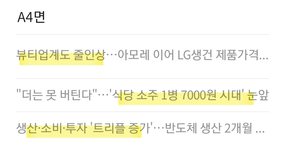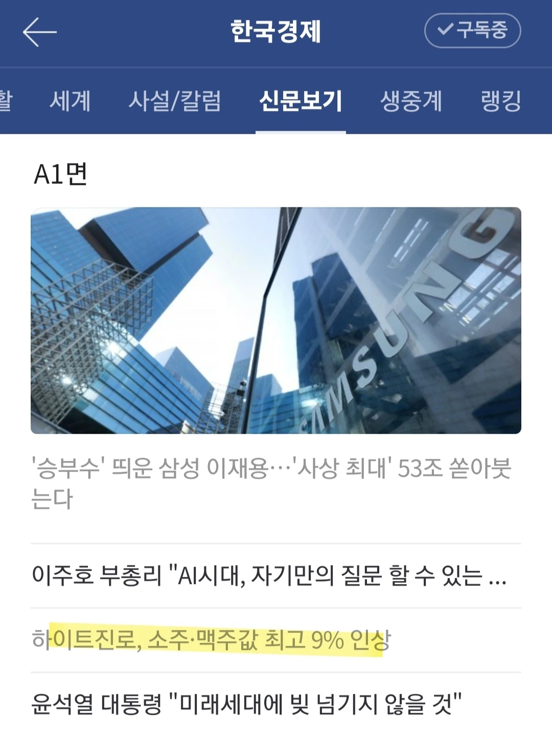 ‘테라’ ‘켈리’ 등 맥주 가격도 같은 날부터 평균 6.8% 인상 (인상 근거)“소주의 주원료인 주정 가격이 연초 10.6% 올랐고, 병 단가도 21.6% 인상”// (식당 가격) 식당이나 주점에서 판매하는 소주 가격이 지금보다 1000원 정도 비싼 6000~7000원이 될 것으로 예상. 2015년까지만 해도 3000~4000원이던 식당 소주 가격.