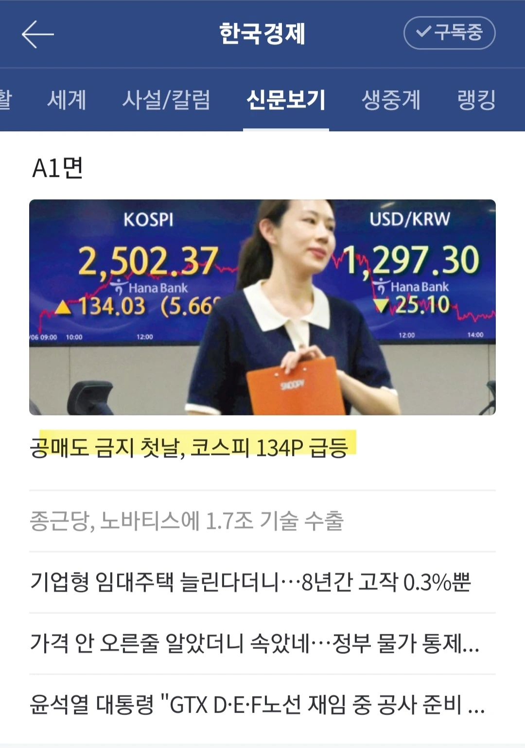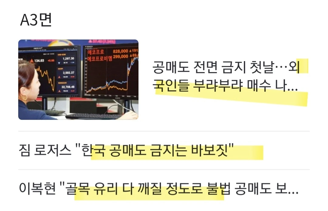 [요약] 공매도 전면 금지 첫날 국내 증시 상승폭이 역대 1위 // 에코프로, 포스코퓨처엠 등 2차전지주는 줄줄이 가격제한폭까지 폭등// 쇼트커버링(공매도 청산을 위한 환매수) 효과가 이어지면서 공매도 상위 종목을 중심으로 국내 증시가 단기적으로 강세를 이어갈 가능성이 있으나 중장기적으로 주가 왜곡과 거품, 외국인 이탈 등 부작용이 나타날 수 있다고 우려