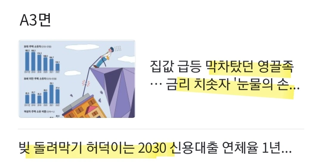 [2030] 고금리·고물가로 빚을 갚지 못하는 20·30대 청년이 증가하면서 연체율이 크게 높아져. / 20·30대의 신용대출 연체율은 1년 새 두 배 수준으로 뛰었고, 20대의 주택담보대출 연체율도 역대 최대 //한은에 따르면 가계대출 중 30대 이하 차주 비중은 2013~2019년 29.6%였지만 2020~2021년에는 38.3%까지 높아졌다.