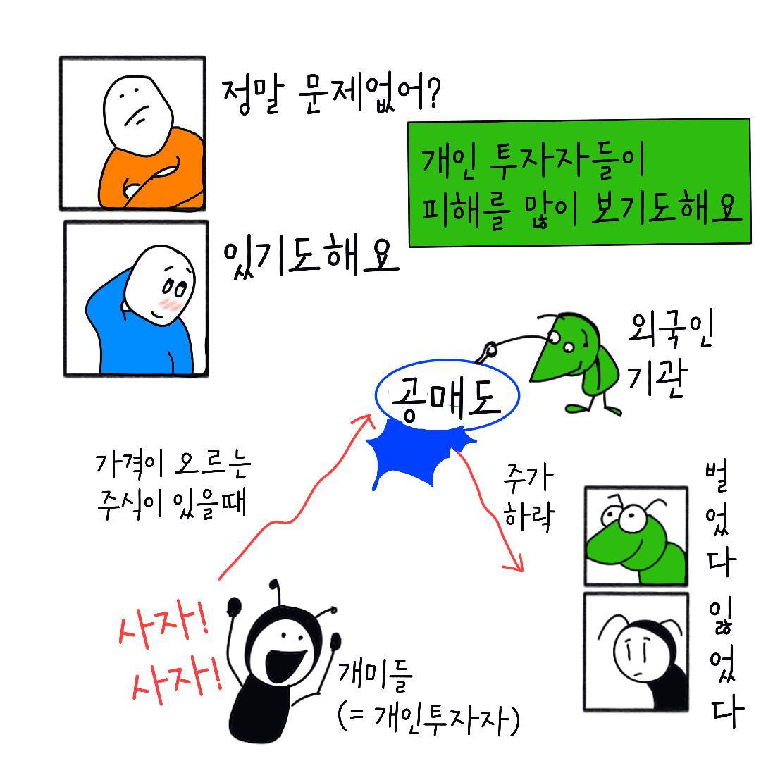 공매도의 부정적 경우는 '오를 이유가 있는데도. 그냥 공매도'를 하는 겁니다. 적절한 이유가 있음에도 계속 공매도를 하면서 수익을 챙기고, 특정 주식은 오를만하면 빠지고, 오를만하면 떨어지는 일이 반복되는 겁니다. 이때 손해를 보는 대상 역시 개미입니다. 개미들이 열심히 분석한 후 오를 것 같아 주식을 샀는데, 공매도로 계속해서 주가가 떨어지는 겁니다. 개미들은 환장하는 거죠. 이 포인트가 개미들이 공매도 금지를 주장하는 지점입니다.
